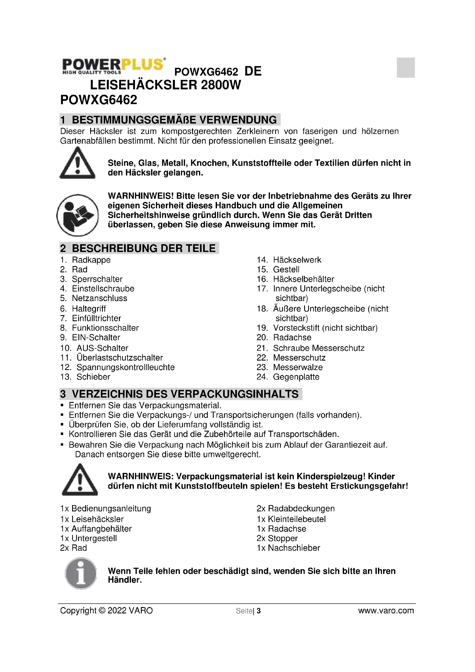 - Bewahren Sie die Verpackung nach Möglichkeit bis zum Ablauf der Garantiezeit auf. Danach entsorgen Sie diese bitte umweltgerecht. WARNHINWEIS: Verpackungsmaterial ist kein Kinderspielzeug! Kinder dürfen nicht mit Kunststoffbeuteln spielen! Es besteht Erstickungsgefahr! 1x Bedienungsanleitung 1x Leisehäcksler 1x Auffangbehälter 1x Untergestell 2x Rad 2x Radabdeckungen 1x Kleinteilebeutel 1x Radachse 2x Stopper 1x Nachschieber Wenn Teile fehlen oder beschädigt sind, wenden Sie sich bitte an Ihren Händler.POWXG6462 DE Copyright © 2022 VARO Seite| 4 www.varo.com