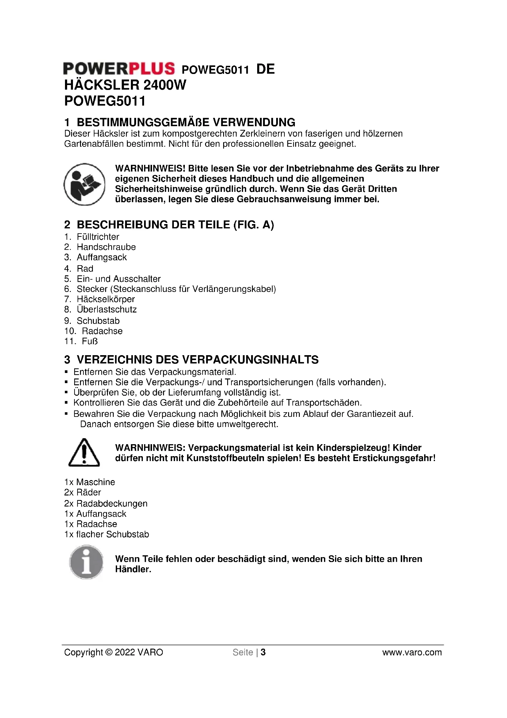 - Bewahren Sie die Verpackung nach Möglichkeit bis zum Ablauf der Garantiezeit auf. Danach entsorgen Sie diese bitte umweltgerecht. WARNHINWEIS: Verpackungsmaterial ist kein Kinderspielzeug! Kinder dürfen nicht mit Kunststoffbeuteln spielen! Es besteht Erstickungsgefahr! 1x Maschine 2x Räder 2x Radabdeckungen 1x Auffangsack 1x Radachse 1x flacher Schubstab Wenn Teile fehlen oder beschädigt sind, wenden Sie sich bitte an Ihren Händler.POWEG5011 DE Copyright © 2022 VARO Seite | 4 www.varo.com