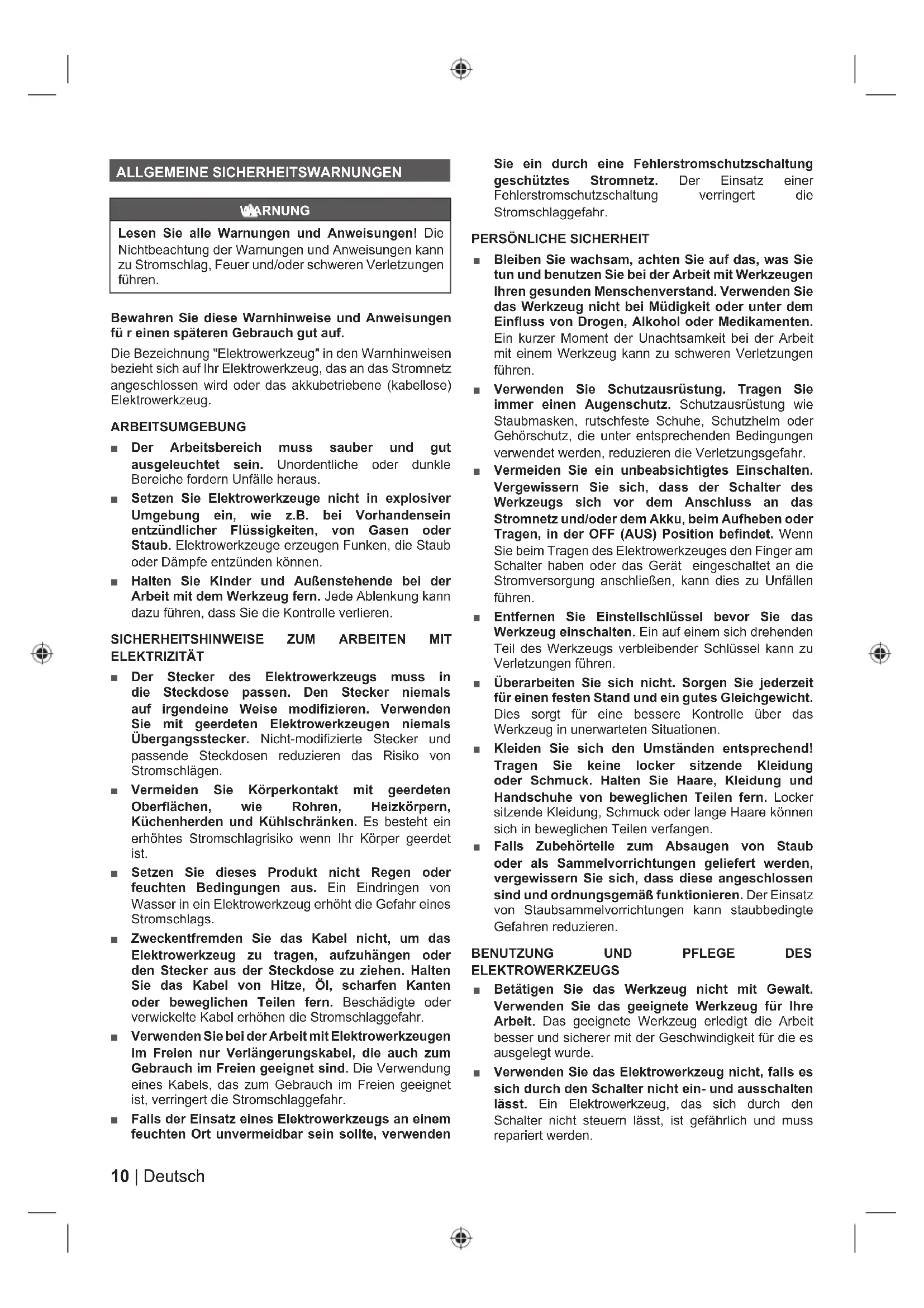 Sans symbole d'alerte de sécurité Indique une situation pouvant entraîner des dommages matériels.10 | Deutsch ALLGEMEINE SICHERHEITSWARNUNGEN WARNUNG Lesen Sie alle Warnungen und Anweisungen! Die Nichtbeachtung der Warnungen und Anweisungen kann zu Stromschlag, Feuer und/oder schweren Verletzungen führen. Bewahren Sie diese Warnhinweise und Anweisungen fü r einen späteren Gebrauch gut auf. Die Bezeichnung "Elektrowerkzeug" in den Warnhinweisen bezieht sich auf Ihr Elektrowerkzeug, das an das Stromnetz angeschlossen wird oder das akkubetriebene (kabellose) Elektrowerkzeug. ARBEITSUMGEBUNG ■ Der Arbeitsbereich muss sauber und gut ausgeleuchtet sein. Unordentliche oder dunkle Bereiche fordern Unfälle heraus. ■ Setzen Sie Elektrowerkzeuge nicht in explosiver Umgebung ein, wie z.B. bei Vorhandensein entzündlicher Flüssigkeiten, von Gasen oder Staub. Elektrowerkzeuge erzeugen Funken, die Staub oder Dämpfe entzünden können. ■ Halten Sie Kinder und Außenstehende bei der Arbeit mit dem Werkzeug fern. Jede Ablenkung kann dazu führen, dass Sie die Kontrolle verlieren.