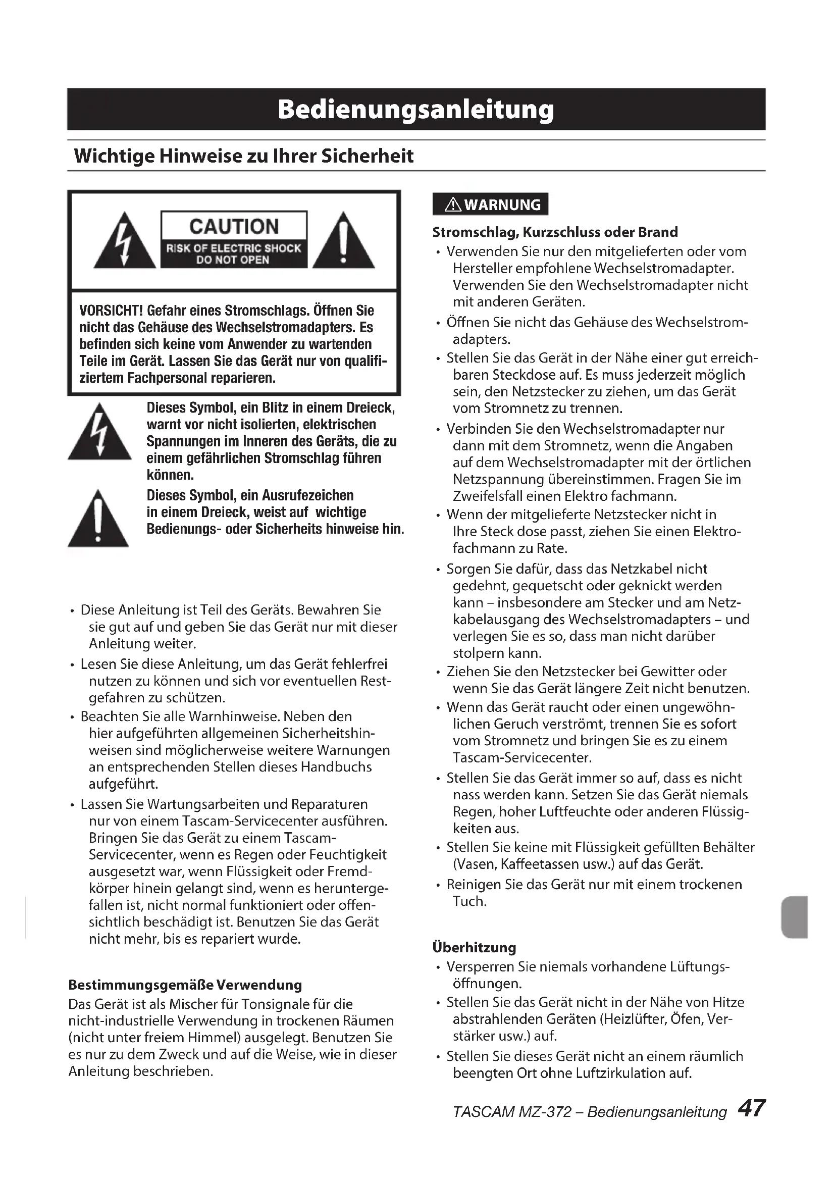 WARNUNG Stromschlag, Kurzschluss oder Brand• Verwenden Sie nur den mitgelieferten oder vom Hersteller empfohlene Wechselstromadapter. Verwenden Sie den Wechselstromadapter nicht mit anderen Geräten.• Öffnen Sie nicht das Gehäuse des Wechselstrom-adapters.• Stellen Sie das Gerät in der Nähe einer gut erreich-baren Steckdose auf. Es muss jederzeit möglich sein, den Netzstecker zu ziehen, um das Gerät vom Stromnetz zu trennen.• Verbinden Sie den Wechselstromadapter nur dann mit dem Stromnetz, wenn die Angaben auf dem Wechselstromadapter mit der örtlichen Netzspannung übereinstimmen. Fragen Sie im Zweifelsfall einen Elektro fachmann.• Wenn der mitgelieferte Netzstecker nicht in Ihre Steck dose passt, ziehen Sie einen Elektro-fachmann zu Rate.• Sorgen Sie dafür, dass das Netzkabel nicht gedehnt, gequetscht oder geknickt werden kann – insbesondere am Stecker und am Netz-kabelausgang des Wechselstromadapters – und verlegen Sie es so, dass man nicht darüber stolpern kann. • Ziehen Sie den Netzstecker bei Gewitter oder wenn Sie das Gerät längere Zeit nicht benutzen.• Wenn das Gerät raucht oder einen ungewöhn-lichen Geruch verströmt, trennen Sie es sofort vom Stromnetz und bringen Sie es zu einem Tascam-Servicecenter.• Stellen Sie das Gerät immer so auf, dass es nicht nass werden kann. Setzen Sie das Gerät niemals Regen, hoher Luftfeuchte oder anderen Flüssig-keiten aus.• Stellen Sie keine mit Flüssigkeit gefüllten Behälter (Vasen, Kaffeetassen usw.) auf das Gerät.• Reinigen Sie das Gerät nur mit einem trockenen Tuch.Überhitzung• Versperren Sie niemals vorhandene Lüftungs-öffnungen. • Stellen Sie das Gerät nicht in der Nähe von Hitze abstrahlenden Geräten (Heizlüfter, Öfen, Ver-stärker usw.) auf.• Stellen Sie dieses Gerät nicht an einem räumlich beengten Ort ohne Luftzirkulation auf. Bedienungsanleitung48 TASCAM MZ-372 – Bedienungsanleitung Falsches Zubehör
