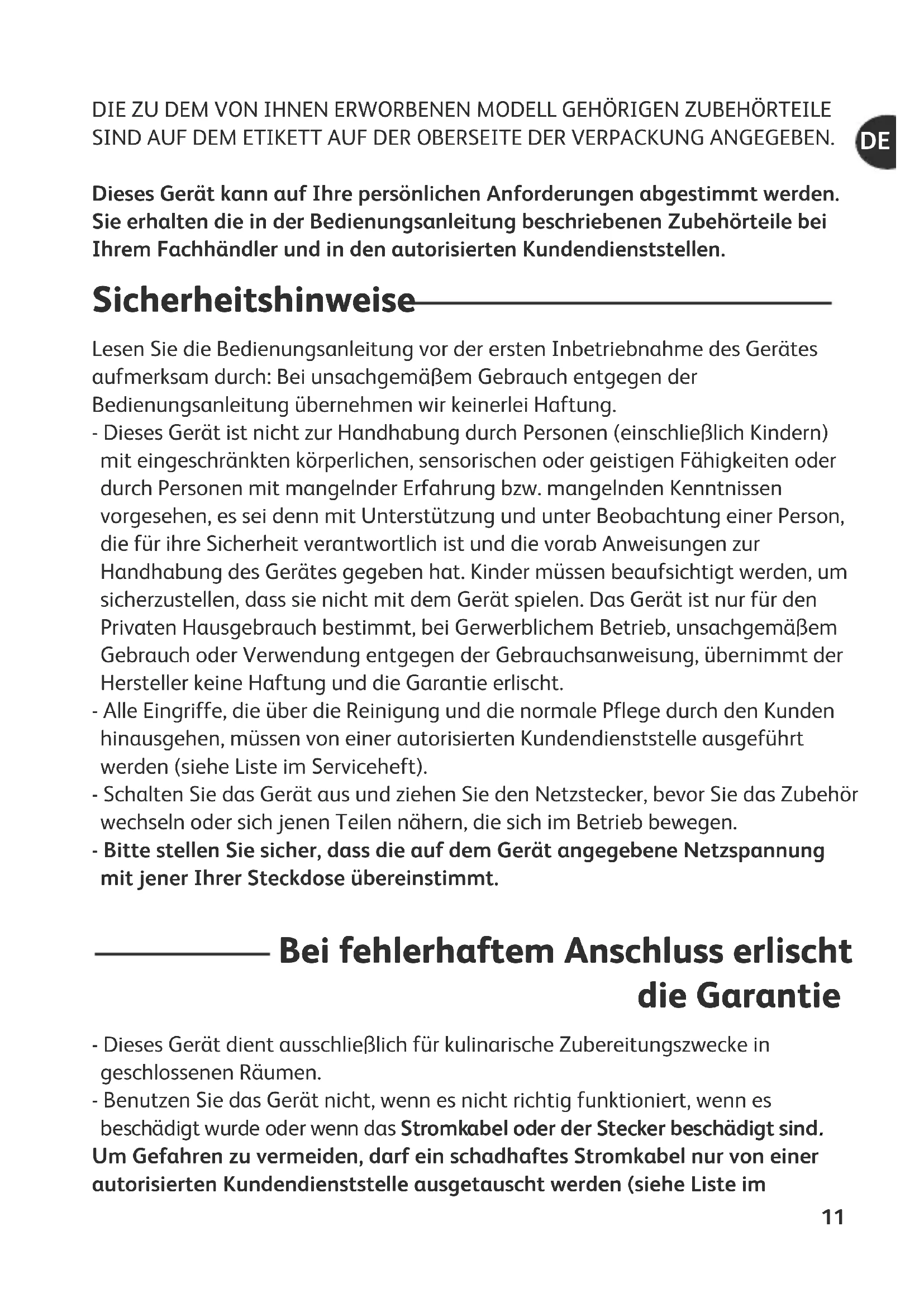 10DIE ZU DEM VON IHNEN ERWORBENEN MODELL GEHÖRIGEN ZUBEHÖRTEILE SIND AUF DEM ETIKETT AUF DER OBERSEITE DER VERPACKUNG ANGEGEBEN. Dieses Gerät kann auf Ihre persönlichen Anforderungen abgestimmt werden. Sie erhalten die in der Bedienungsanleitung beschriebenen Zubehörteile bei Ihrem Fachhändler und in den autorisierten Kundendienststellen. Sicherheitshinweise Lesen Sie die Bedienungsanleitung vor der ersten Inbetriebnahme des Gerätes aufmerksam durch: Bei unsachgemäßem Gebrauch entgegen der Bedienungsanleitung übernehmen wir keinerlei Haftung. - Dieses Gerät ist nicht zur Handhabung durch Personen (einschließlich Kindern) mit eingeschränkten körperlichen, sensorischen oder geistigen Fähigkeiten oder durch Personen mit mangelnder Erfahrung bzw. mangelnden Kenntnissen vorgesehen, es sei denn mit Unterstützung und unter Beobachtung einer Person, die für ihre Sicherheit verantwortlich ist und die vorab Anweisungen zur Handhabung des Gerätes gegeben hat. Kinder müssen beaufsichtigt werden, um sicherzustellen, dass sie nicht mit dem Gerät spielen. Das Gerät ist nur für den Privaten Hausgebrauch bestimmt, bei Gerwerblichem Betrieb, unsachgemäßem Gebrauch oder Verwendung entgegen der Gebrauchsanweisung, übernimmt der Hersteller keine Haftung und die Garantie erlischt. - Alle Eingriffe, die über die Reinigung und die normale Pflege durch den Kunden hinausgehen, müssen von einer autorisierten Kundendienststelle ausgeführt werden (siehe Liste im Serviceheft). - Schalten Sie das Gerät aus und ziehen Sie den Netzstecker, bevor Sie das Zubehör wechseln oder sich jenen Teilen nähern, die sich im Betrieb bewegen. - Bitte stellen Sie sicher, dass die auf dem Gerät angegebene Netzspannung mit jener Ihrer Steckdose übereinstimmt. Bei fehlerhaftem Anschluss erlischt die Garantie - Dieses Gerät dient ausschließlich für kulinarische Zubereitungszwecke in geschlossenen Räumen. - Benutzen Sie das Gerät nicht, wenn es nicht richtig funktioniert, wenn es beschädigt wurde oder wenn das Stromkabel oder der Stecker beschädigt sind. Um Gefahren zu vermeiden, darf ein schadhaftes Stromkabel nur von einer autorisierten Kundendienststelle ausgetauscht werden (siehe Liste im