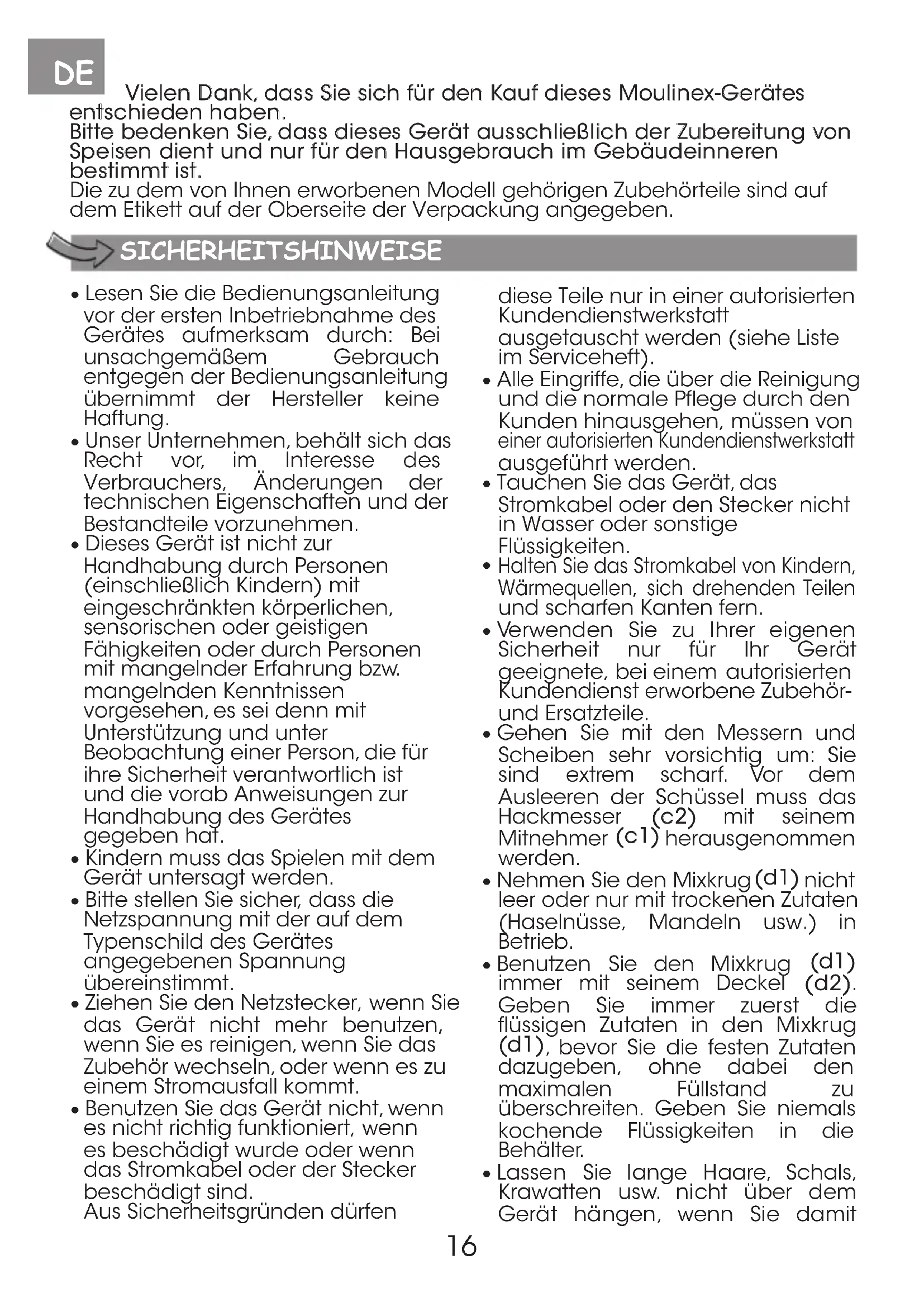 - Ziehen Sie den Stecker des Gerätes aus der Steckdose. Die Schneiden der Zubehörteile sind sehr scharf. Gehen Sie vorsichtig damit um.