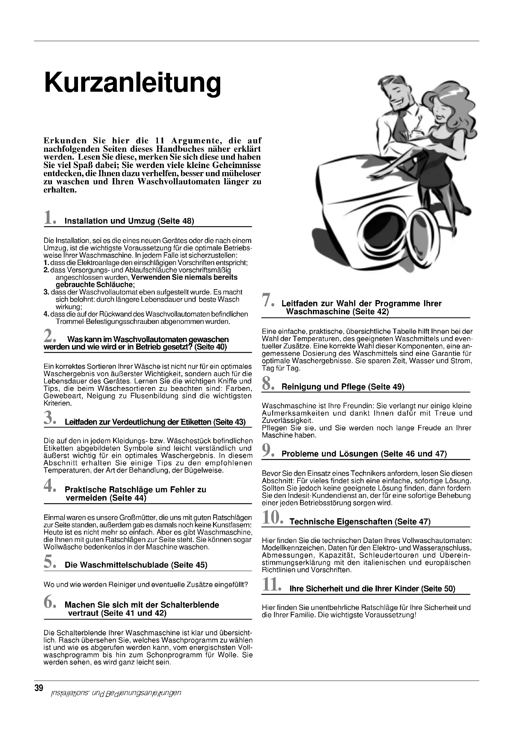 Instructions for installation and use 38Erkunden Sie hier die 11 Argumente, die auf nachfolgenden Seiten dieses Handbuches näher erklärt werden. Lesen Sie diese, merken Sie sich diese und haben Sie viel Spaß dabei; Sie werden viele kleine Geheimnisse entdecken, die Ihnen dazu verhelfen, besser und müheloser zu waschen und Ihren Waschvollautomaten länger zu erhalten. Kurzanleitung