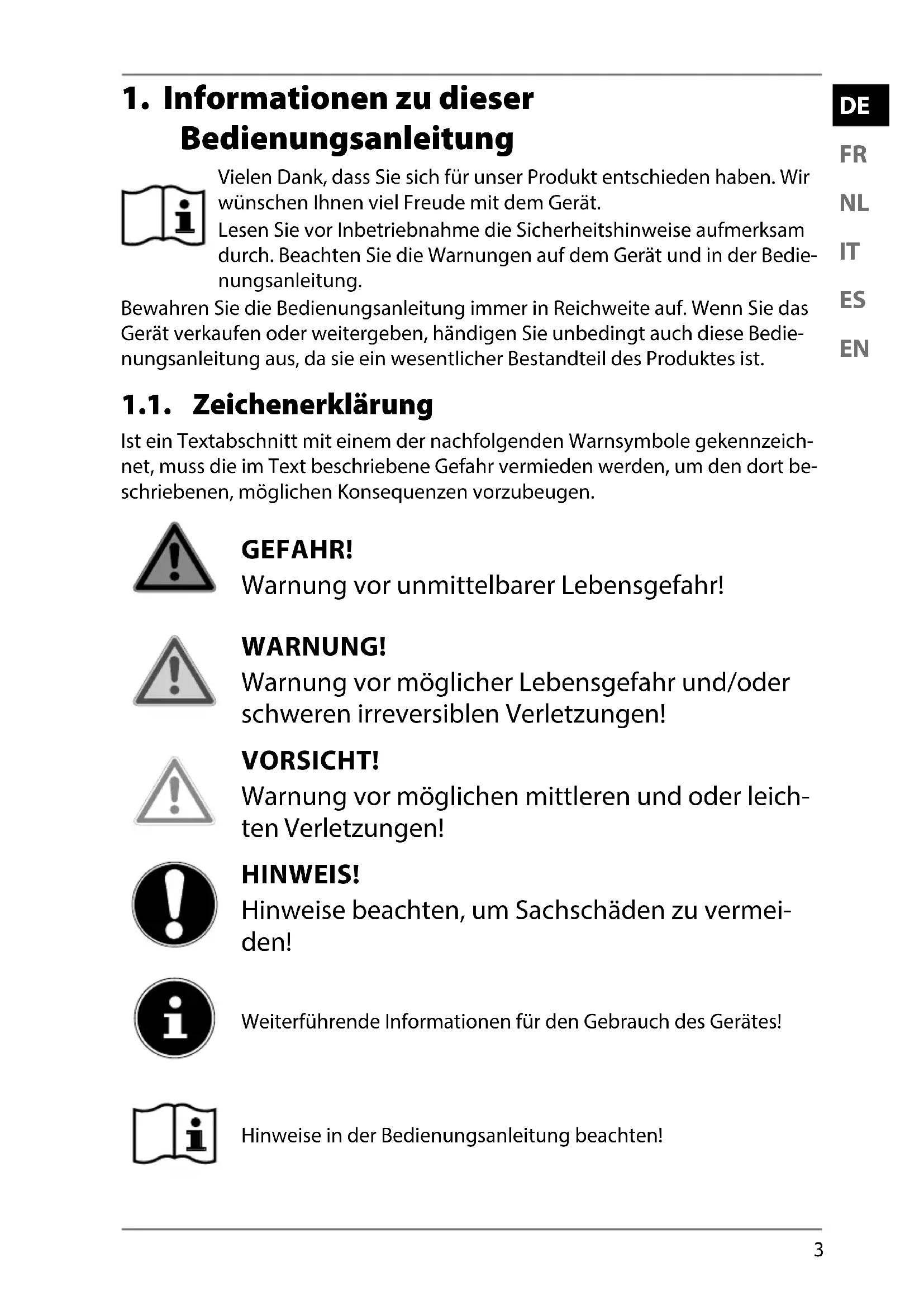 Bedienungsanleitung Vielen Dank, dass Sie sich für unser Produkt entschieden haben. Wir wünschen Ihnen viel Freude mit dem Gerät. Lesen Sie vor Inbetriebnahme die Sicherheitshinweise aufmerksam durch. Beachten Sie die Warnungen auf dem Gerät und in der Bedie- nungsanleitung. Bewahren Sie die Bedienungsanleitung immer in Reichweite auf. Wenn Sie das Gerät verkaufen oder weitergeben, händigen Sie unbedingt auch diese Bedie- nungsanleitung aus, da sie ein wesentlicher Bestandteil des Produktes ist. 1.1. Zeichenerklärung Ist ein Textabschnitt mit einem der nachfolgenden Warnsymbole gekennzeich- net, muss die im Text beschriebene Gefahr vermieden werden, um den dort be- schriebenen, möglichen Konsequenzen vorzubeugen. GEFAHR! Warnung vor unmittelbarer Lebensgefahr! WARNUNG! Warnung vor möglicher Lebensgefahr und/oder schweren irreversiblen Verletzungen! VORSICHT! Warnung vor möglichen mittleren und oder leich- ten Verletzungen! HINWEIS! Hinweise beachten, um Sachschäden zu vermei- den! Weiterführende Informationen für den Gebrauch des Gerätes! Hinweise in der Bedienungsanleitung beachten!4 WARNUNG! Warnung vor Gefahr durch elektrischen Schlag!