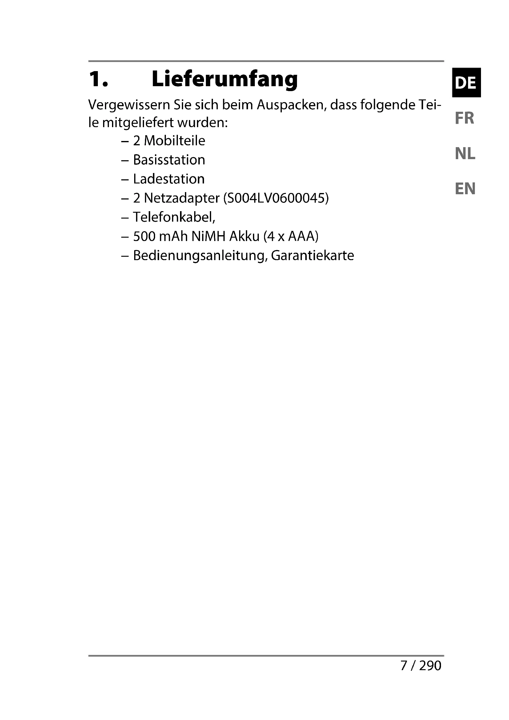Vergewissern Sie sich beim Auspacken, dass folgende Tei- le mitgeliefert wurden: − 2 Mobilteile − Basisstation − Ladestation − 2 Netzadapter (S004LV0600045) − Telefonkabel, − 500 mAh NiMH Akku (4 x AAA) − Bedienungsanleitung, Garantiekarte 84902 MULI eCommerce Content Final.indb 784902 MULI eCommerce Content Final.indb 7 06.05.2015 09:08:2306.05.2015 09:08:238 / 290