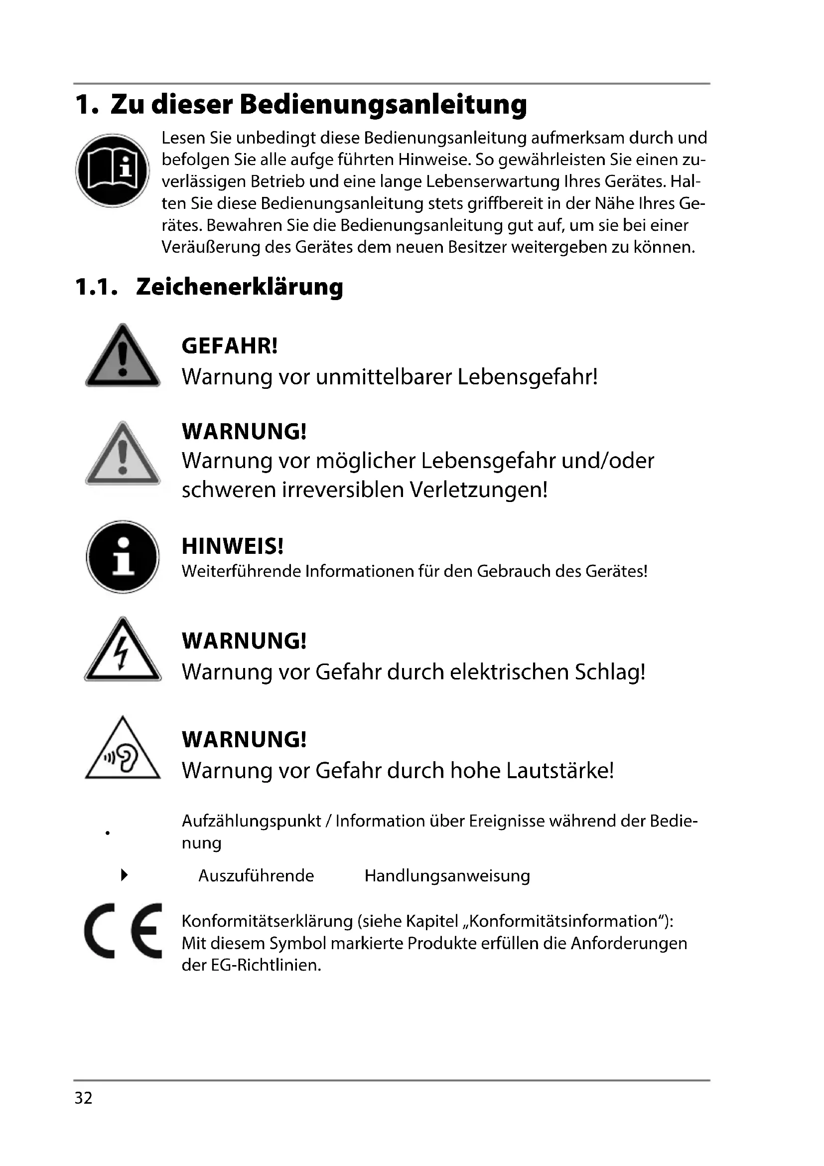 Lesen Sie unbedingt diese Bedienungsanleitung aufmerksam durch und befolgen Sie alle aufge führten Hinweise. So gewährleisten Sie einen zu- verlässigen Betrieb und eine lange Lebenserwartung Ihres Gerätes. Hal- ten Sie diese Bedienungsanleitung stets griffbereit in der Nähe Ihres Ge- rätes. Bewahren Sie die Bedienungsanleitung gut auf, um sie bei einer Veräußerung des Gerätes dem neuen Besitzer weitergeben zu können. 1.1. Zeichenerklärung GEFAHR! Warnung vor unmittelbarer Lebensgefahr! WARNUNG! Warnung vor möglicher Lebensgefahr und/oder schweren irreversiblen Verletzungen! HINWEIS! Weiterführende Informationen für den Gebrauch des Gerätes! WARNUNG! Warnung vor Gefahr durch elektrischen Schlag! WARNUNG! Warnung vor Gefahr durch hohe Lautstärke!