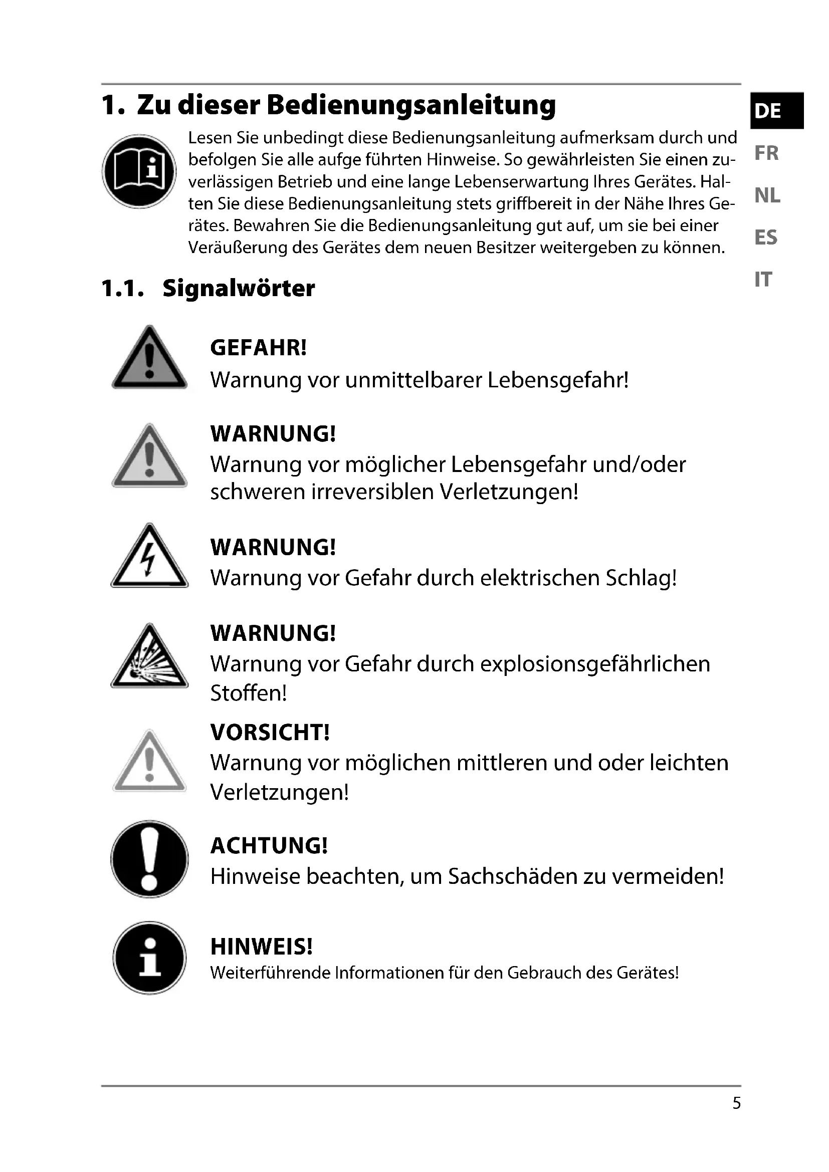 Lesen Sie unbedingt diese Bedienungsanleitung aufmerksam durch und befolgen Sie alle aufge führten Hinweise. So gewährleisten Sie einen zu- verlässigen Betrieb und eine lange Lebenserwartung Ihres Gerätes. Hal- ten Sie diese Bedienungsanleitung stets griffbereit in der Nähe Ihres Ge- rätes. Bewahren Sie die Bedienungsanleitung gut auf, um sie bei einer Veräußerung des Gerätes dem neuen Besitzer weitergeben zu können. 1.1. Signalwörter GEFAHR! Warnung vor unmittelbarer Lebensgefahr! WARNUNG! Warnung vor möglicher Lebensgefahr und/oder schweren irreversiblen Verletzungen! WARNUNG! Warnung vor Gefahr durch elektrischen Schlag! WARNUNG! Warnung vor Gefahr durch explosionsgefährlichen Stoffen! VORSICHT! Warnung vor möglichen mittleren und oder leichten Verletzungen! ACHTUNG! Hinweise beachten, um Sachschäden zu vermeiden! HINWEIS! Weiterführende Informationen für den Gebrauch des Gerätes! 18004 MULI-WE MSN 5005 6215 Content final.indb 518004 MULI-WE MSN 5005 6215 Content final.indb 5 09.08.2017 13:30:1509.08.2017 13:30:156 HINWEIS! Hinweise in der Bedienungsanleitung beachten!