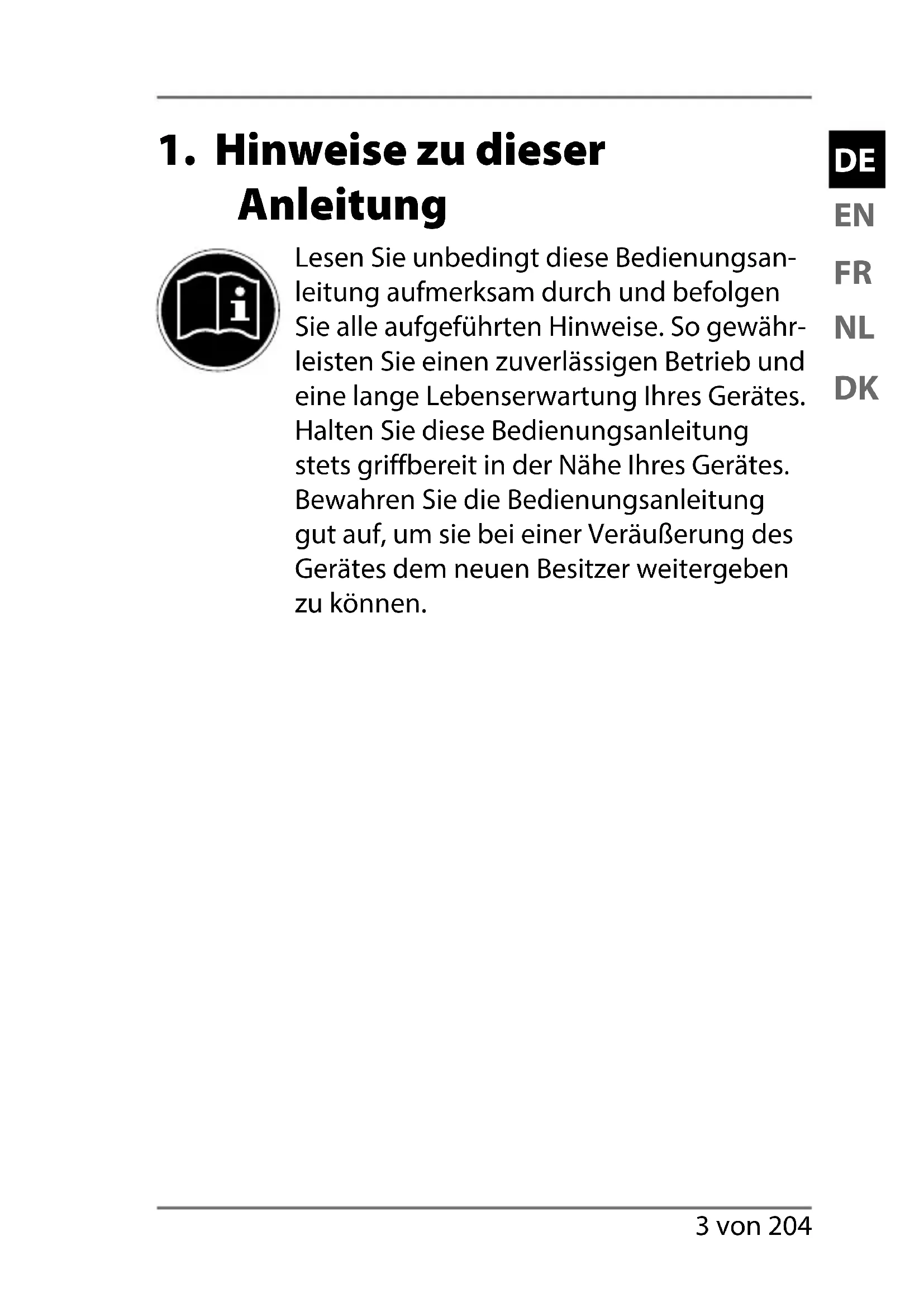 Anleitung Lesen Sie unbedingt diese Bedienungsan- leitung aufmerksam durch und befolgen Sie alle aufgeführten Hinweise. So gewähr- leisten Sie einen zuverlässigen Betrieb und eine lange Lebenserwartung Ihres Gerätes. Halten Sie diese Bedienungsanleitung stets griffbereit in der Nähe Ihres Gerätes. Bewahren Sie die Bedienungsanleitung gut auf, um sie bei einer Veräußerung des Gerätes dem neuen Besitzer weitergeben zu können. 84950 eComm ML Content Final REV7.indb 384950 eComm ML Content Final REV7.indb 3 26.05.2015 10:43:4626.05.2015 10:43:464 von 204 1.1. Verwendete Warnsymbole und Signalwörter GEFAHR! Warnung vor unmittelbarer Lebensgefahr! WARNUNG! Warnung vor möglicher Le- bensgefahr und/oder schwe- ren irreversiblen Verletzun- gen! VORSICHT! Warnung vor möglichen mitt- leren und oder leichten Verlet- zungen! ACHTUNG! Hinweise beachten, um Sach- schäden zu vermeiden! HINWEIS! Weiterführende Informationen für den Gebrauch des Gerätes! 84950 eComm ML Content Final REV7.indb 484950 eComm ML Content Final REV7.indb 4 26.05.2015 10:43:4826.05.2015 10:43:485 von 204