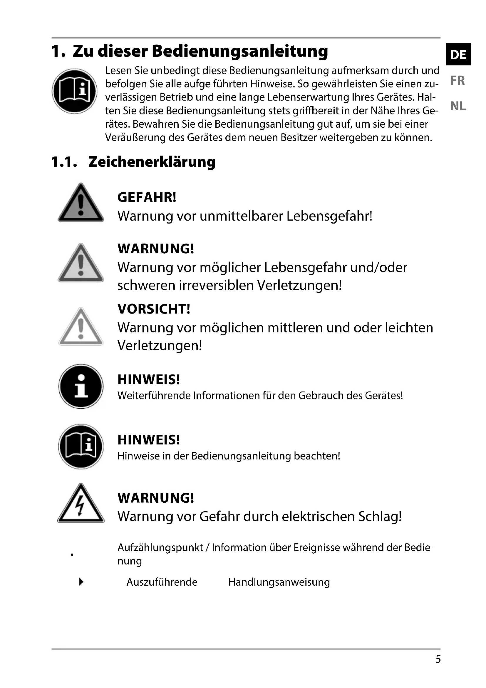 Lesen Sie unbedingt diese Bedienungsanleitung aufmerksam durch und befolgen Sie alle aufge führten Hinweise. So gewährleisten Sie einen zu- verlässigen Betrieb und eine lange Lebenserwartung Ihres Gerätes. Hal- ten Sie diese Bedienungsanleitung stets griffbereit in der Nähe Ihres Ge- rätes. Bewahren Sie die Bedienungsanleitung gut auf, um sie bei einer Veräußerung des Gerätes dem neuen Besitzer weitergeben zu können. 1.1. Zeichenerklärung GEFAHR! Warnung vor unmittelbarer Lebensgefahr! WARNUNG! Warnung vor möglicher Lebensgefahr und/oder schweren irreversiblen Verletzungen! VORSICHT! Warnung vor möglichen mittleren und oder leichten Verletzungen! HINWEIS! Weiterführende Informationen für den Gebrauch des Gerätes! HINWEIS! Hinweise in der Bedienungsanleitung beachten! WARNUNG! Warnung vor Gefahr durch elektrischen Schlag!