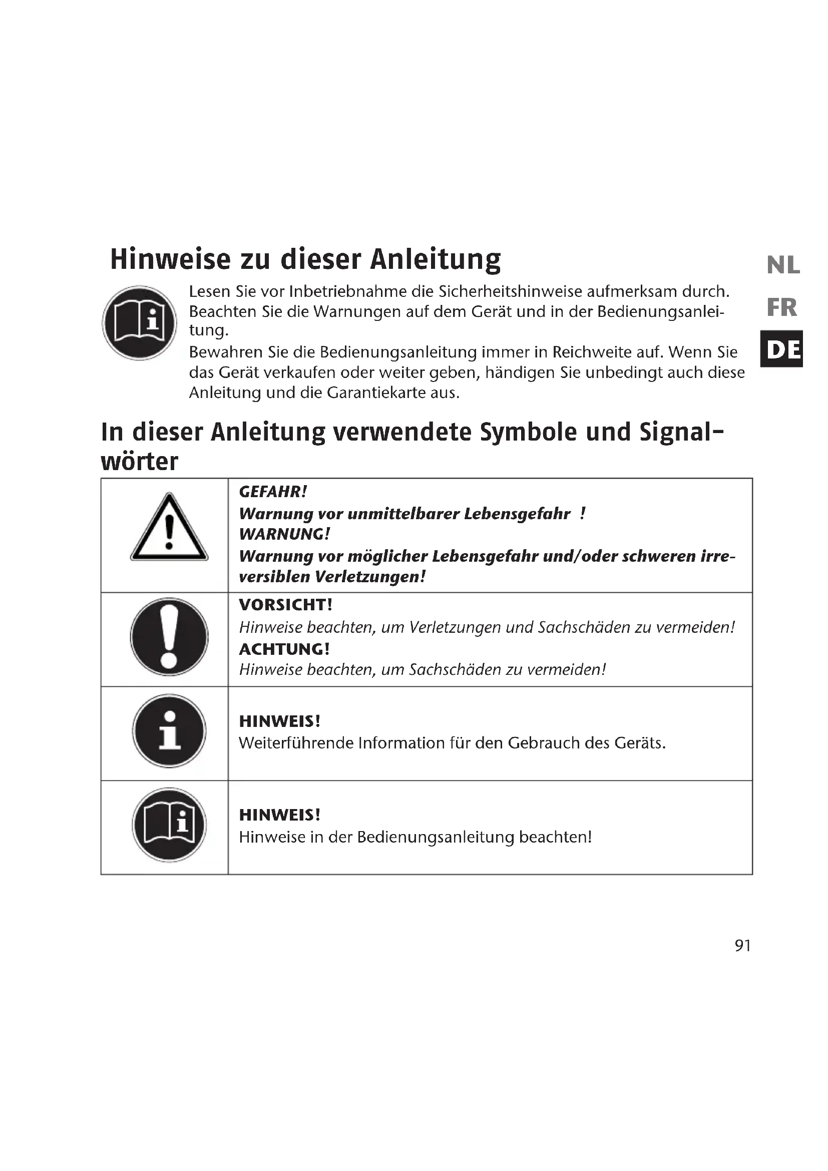 Hinweise zu dieser Anleitung Lesen Sie vor Inbetriebnahme die Sicherheitshinweise aufmerksam durch. Beachten Sie die Warnungen auf dem Gerät und in der Bedienungsanlei- tung. Bewahren Sie die Bedienungsanleitung immer in Reichweite auf. Wenn Sie das Gerät verkaufen oder weiter geben, händigen Sie unbedingt auch diese Anleitung und die Garantiekarte aus. In dieser Anleitung verwendete Symbole und Signal- wörter GEFAHR! Warnung vor unmittelbarer Lebensgefahr ! WARNUNG! Warnung vor möglicher Lebensgefahr und/oder schweren irre- versiblen Verletzungen! VORSICHT! Hinweise beachten, um Verletzungen und Sachschäden zu vermeiden! ACHTUNG! Hinweise beachten, um Sachschäden zu vermeiden! HINWEIS! Weiterführende Information für den Gebrauch des Geräts. HINWEIS! Hinweise in der Bedienungsanleitung beachten! 86423 BE ALDI BE Content RC1.indb 9186423 BE ALDI BE Content RC1.indb 91 20.09.2012 15:18:0020.09.2012 15:18:0092 WARNUNG! Warnung vor Gefahr durch elektrischen Schlag!