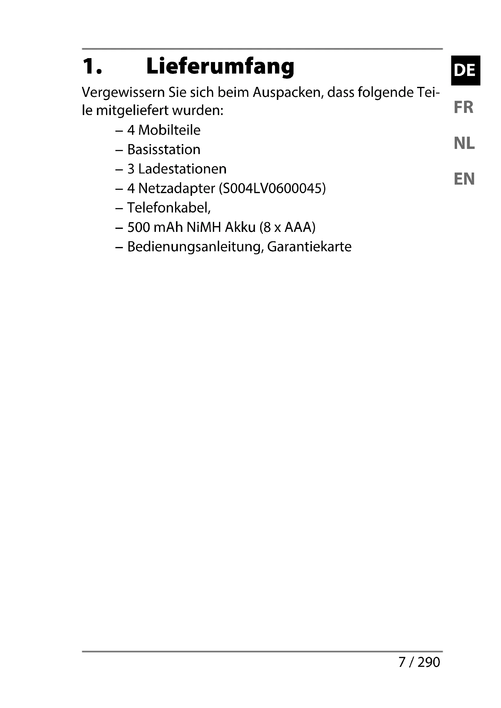 Vergewissern Sie sich beim Auspacken, dass folgende Tei- le mitgeliefert wurden: − 4 Mobilteile − Basisstation − 3 Ladestationen − 4 Netzadapter (S004LV0600045) − Telefonkabel, − 500 mAh NiMH Akku (8 x AAA) − Bedienungsanleitung, Garantiekarte 84994 MULI eCommerce Content Final.indb 784994 MULI eCommerce Content Final.indb 7 21.05.2015 08:31:4021.05.2015 08:31:408 / 290