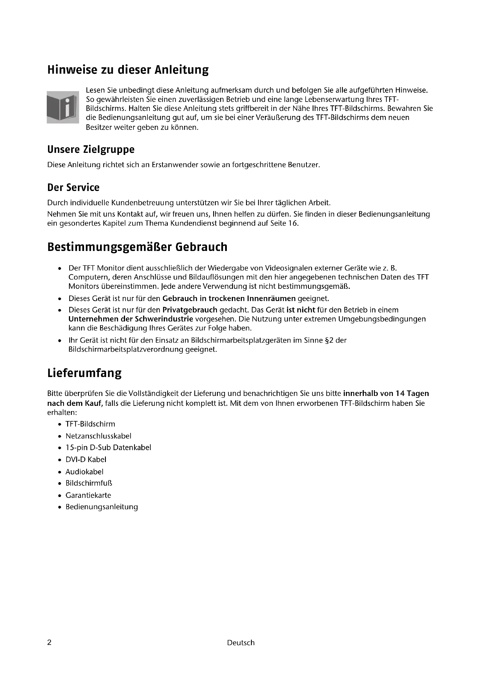 Hinweise zu dieser Anleitung Lesen Sie unbedingt diese Anleitung aufmerksam durch und befolgen Sie alle aufgeführten Hinweise. So gewährleisten Sie einen zuverlässigen Betrieb und eine lange Lebenserwartung Ihres TFT- Bildschirms. Halten Sie diese Anleitung stets griffbereit in der Nähe Ihres TFT-Bildschirms. Bewahren Sie die Bedienungsanleitung gut auf, um sie bei einer Veräußerung des TFT-Bildschirms dem neuen Besitzer weiter geben zu können. Unsere Zielgruppe Diese Anleitung richtet sich an Erstanwender sowie an fortgeschrittene Benutzer. Der Service Durch individuelle Kundenbetreuung unterstützen wir Sie bei Ihrer täglichen Arbeit. Nehmen Sie mit uns Kontakt auf, wir freuen uns, Ihnen helfen zu dürfen. Sie finden in dieser Bedienungsanleitung ein gesondertes Kapitel zum Thema Kundendienst beginnend auf Seite 16. Bestimmungsgemäßer Gebrauch Der TFT Monitor dient ausschließlich der Wiedergabe von Videosignalen externer Geräte wie z. B. Computern, deren Anschlüsse und Bildauflösungen mit den hier angegebenen technischen Daten des TFT Monitors übereinstimmen. Jede andere Verwendung ist nicht bestimmungsgemäß. Dieses Gerät ist nur für den Gebrauch in trockenen Innenräumen geeignet. Dieses Gerät ist nur für den Privatgebrauch gedacht. Das Gerät ist nicht für den Betrieb in einem Unternehmen der Schwerindustrie vorgesehen. Die Nutzung unter extremen Umgebungsbedingungen kann die Beschädigung Ihres Gerätes zur Folge haben. Ihr Gerät ist nicht für den Einsatz an Bildschirmarbeitsplatzgeräten im Sinne §2 der Bildschirmarbeitsplatzverordnung geeignet. Lieferumfang Bitte überprüfen Sie die Vollständigkeit der Lieferung und benachrichtigen Sie uns bitte innerhalb von 14 Tagen nach dem Kauf, falls die Lieferung nicht komplett ist. Mit dem von Ihnen erworbenen TFT-Bildschirm haben Sie erhalten: TFT-Bildschirm Netzanschlusskabel 15-pin D-Sub Datenkabel DVI-D Kabel Audiokabel Bildschirmfuß Garantiekarte BedienungsanleitungSicherheitshinweise