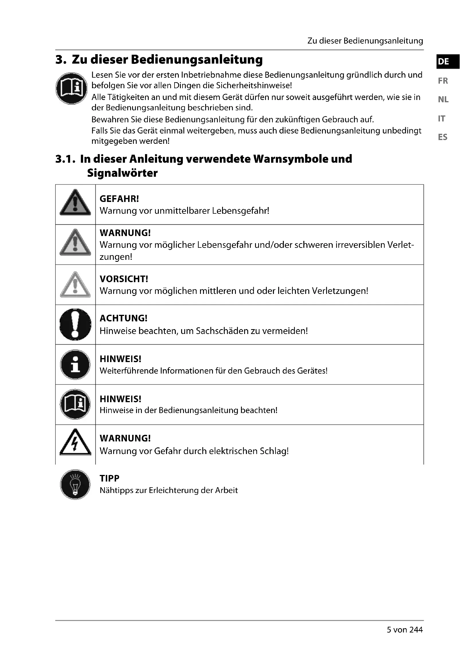 Lesen Sie vor der ersten Inbetriebnahme diese Bedienungsanleitung gründlich durch und befolgen Sie vor allen Dingen die Sicherheitshinweise! Alle Tätigkeiten an und mit diesem Gerät dürfen nur soweit ausgeführt werden, wie sie in der Bedienungsanleitung beschrieben sind. Bewahren Sie diese Bedienungsanleitung für den zukünftigen Gebrauch auf. Falls Sie das Gerät einmal weitergeben, muss auch diese Bedienungsanleitung unbedingt mitgegeben werden! 3.1. In dieser Anleitung verwendete Warnsymbole und Signalwörter GEFAHR! Warnung vor unmittelbarer Lebensgefahr! WARNUNG! Warnung vor möglicher Lebensgefahr und/oder schweren irreversiblen Verlet- zungen! VORSICHT! Warnung vor möglichen mittleren und oder leichten Verletzungen! ACHTUNG! Hinweise beachten, um Sachschäden zu vermeiden! HINWEIS! Weiterführende Informationen für den Gebrauch des Gerätes! HINWEIS! Hinweise in der Bedienungsanleitung beachten! WARNUNG! Warnung vor Gefahr durch elektrischen Schlag! TIPP Nähtipps zur Erleichterung der Arbeit 18205 ML WE ML Content 5005 6038 final.indb 518205 ML WE ML Content 5005 6038 final.indb 5 06.07.2017 08:12:3506.07.2017 08:12:356 von 244 Bestimmungsgemäßer Gebrauch