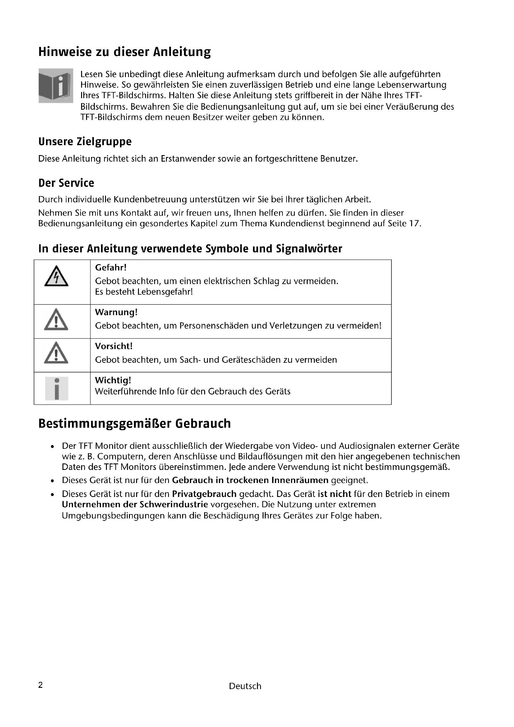 Hinweise zu dieser Anleitung Lesen Sie unbedingt diese Anleitung aufmerksam durch und befolgen Sie alle aufgeführten Hinweise. So gewährleisten Sie einen zuverlässigen Betrieb und eine lange Lebenserwartung Ihres TFT-Bildschirms. Halten Sie diese Anleitung stets griffbereit in der Nähe Ihres TFT- Bildschirms. Bewahren Sie die Bedienungsanleitung gut auf, um sie bei einer Veräußerung des TFT-Bildschirms dem neuen Besitzer weiter geben zu können. Unsere Zielgruppe Diese Anleitung richtet sich an Erstanwender sowie an fortgeschrittene Benutzer. Der Service Durch individuelle Kundenbetreuung unterstützen wir Sie bei Ihrer täglichen Arbeit. Nehmen Sie mit uns Kontakt auf, wir freuen uns, Ihnen helfen zu dürfen. Sie finden in dieser Bedienungsanleitung ein gesondertes Kapitel zum Thema Kundendienst beginnend auf Seite 17. In dieser Anleitung verwendete Symbole und Signalwörter Gefahr! Gebot beachten, um einen elektrischen Schlag zu vermeiden. Es besteht Lebensgefahr! Warnung! Gebot beachten, um Personenschäden und Verletzungen zu vermeiden! Vorsicht! Gebot beachten, um Sach- und Geräteschäden zu vermeiden Wichtig! Weiterführende Info für den Gebrauch des Geräts Bestimmungsgemäßer Gebrauch Der TFT Monitor dient ausschließlich der Wiedergabe von Video- und Audiosignalen externer Geräte wie z. B. Computern, deren Anschlüsse und Bildauflösungen mit den hier angegebenen technischen Daten des TFT Monitors übereinstimmen. Jede andere Verwendung ist nicht bestimmungsgemäß. Dieses Gerät ist nur für den Gebrauch in trockenen Innenräumen geeignet. Dieses Gerät ist nur für den Privatgebrauch gedacht. Das Gerät ist nicht für den Betrieb in einem Unternehmen der Schwerindustrie vorgesehen. Die Nutzung unter extremen Umgebungsbedingungen kann die Beschädigung Ihres Gerätes zur Folge haben.Lieferumfang