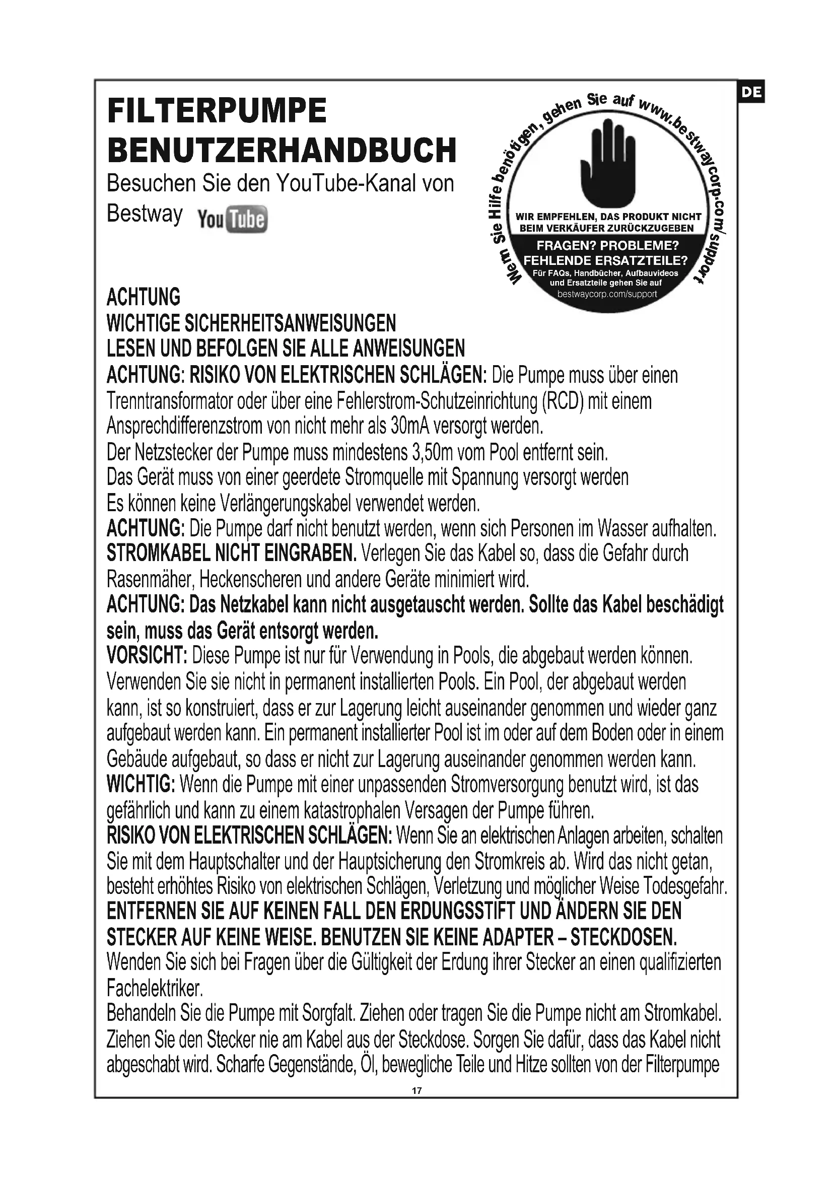 - Wenn Sie das Produkt während des Urlaubs unbeaufsichtigt lassen Bewahren Sie diese Anweisungen sorgfältig auf. Beachten Sie bei jedem erneuten Aufbau des Pools diese Anweisungen. Sollten diese Anweisungen verloren gehen, kontaktieren Sie Bestway oder suchen Sie das Dokument auf unserer Website: www.bestwaycorp.com ANMERKUNG: Dieses Produkt darf nicht für kommerzielle Zwecke benutzt werden. Bitte lesen Sie das Handbuch sorgfältig durch und bewahren Sie es als künftige Referenz auf. BEWAHREN SIE DIESE ANWEISUNGEN AUF. FILTERPUMPE BENUTZERHANDBUCH Besuchen Sie den YouTube-Kanal von Bestway