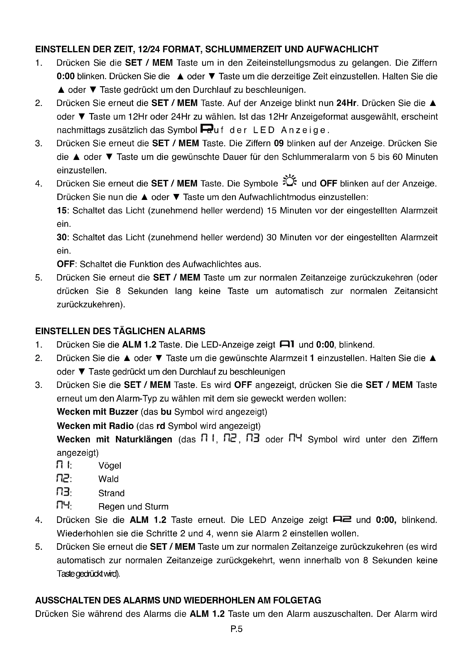 Drücken Sie während des Alarms die Zz Taste. Der Alarm verstummt und ertont erneut nach der eingestellten Schlummerzeit (5-60 Minuten). Drücken Sie während des Alarms die ALM 1.2 Taste um den Alarm auszuschalten. Der Alarm wird automatisch für den nachsten Tag zurückgesetzt.