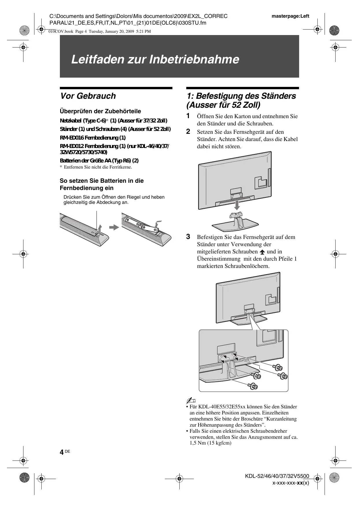 - Die Beschriftung “x”, die in der Modellbezeichnung steht, entspricht der Zahl für die Farbvariationen. 2 DE KDL-52/46/40/37/32V5500 x-xxx-xxx-xx(x) C:\Documents and Settings\Dolors\Mis documentos\2009\EX2L_CORREC PARAL\21_DE,ES,FR,IT,NL,PT\01_(21)01DE(OLC6)\010COVTOC.fm masterpage:Left 010COV.book Page 3 Tuesday, January 20, 2009 5:21 PM Inhaltsverzeichnis Leitfaden zur Inbetriebnahme