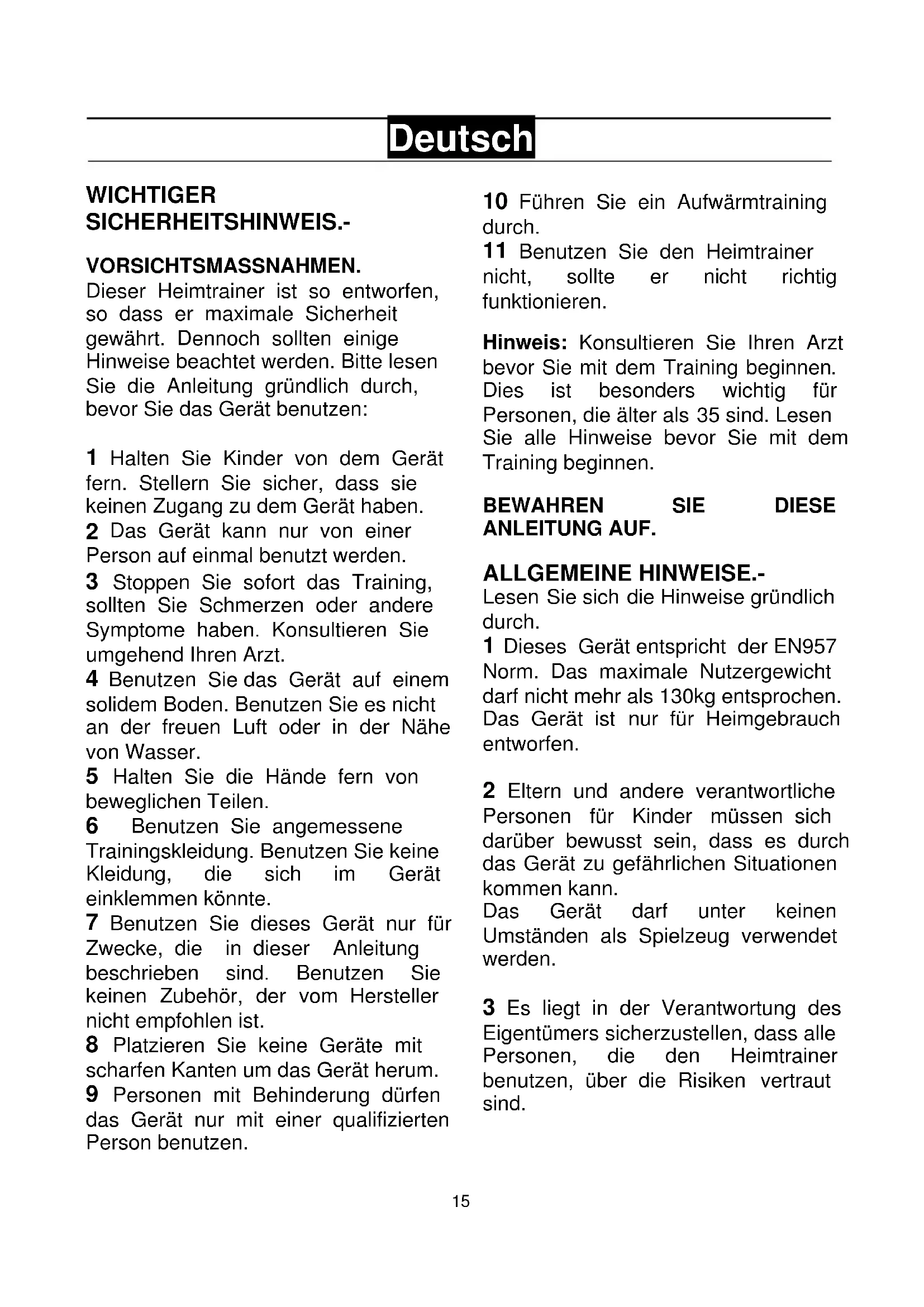 Deutsch WICHTIGER SICHERHEITSHINWEIS.- VORSICHTSMASSNAHMEN. Dieser Heimtrainer ist so entworfen, so dass er maximale Sicherheit gewährt. Dennoch sollten einige Hinweise beachtet werden. Bitte lesen Sie die Anleitung gründlich durch, bevor Sie das Gerät benutzen: