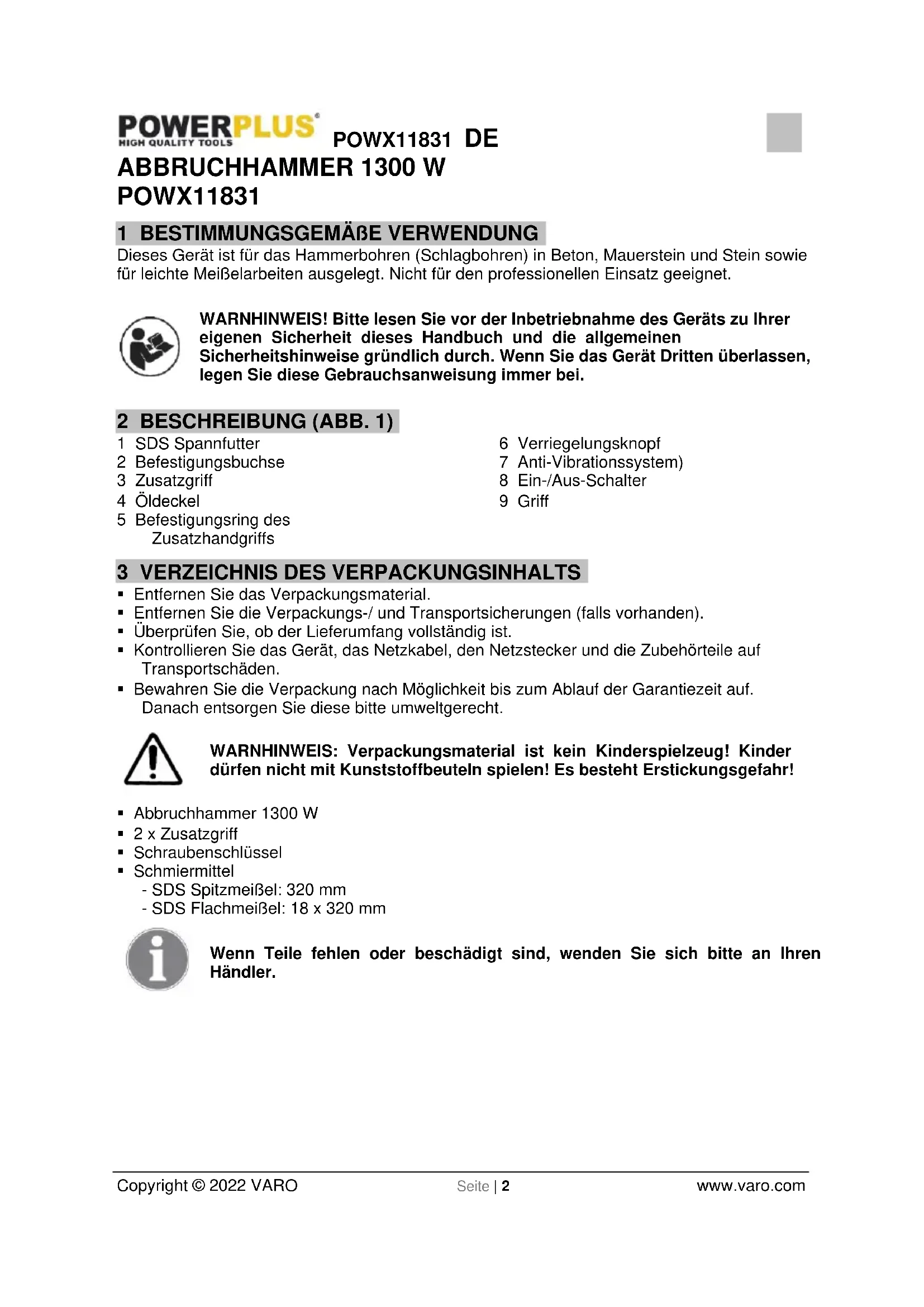 - Schmiermittel - SDS Spitzmeißel: 320 mm - SDS Flachmeißel: 18 x 320 mm Wenn Teile fehlen oder beschädigt sind, wenden Sie sich bitte an Ihren Händler.POWX11831 DE Copyright © 2022 VARO Seite | 3 www.varo.com