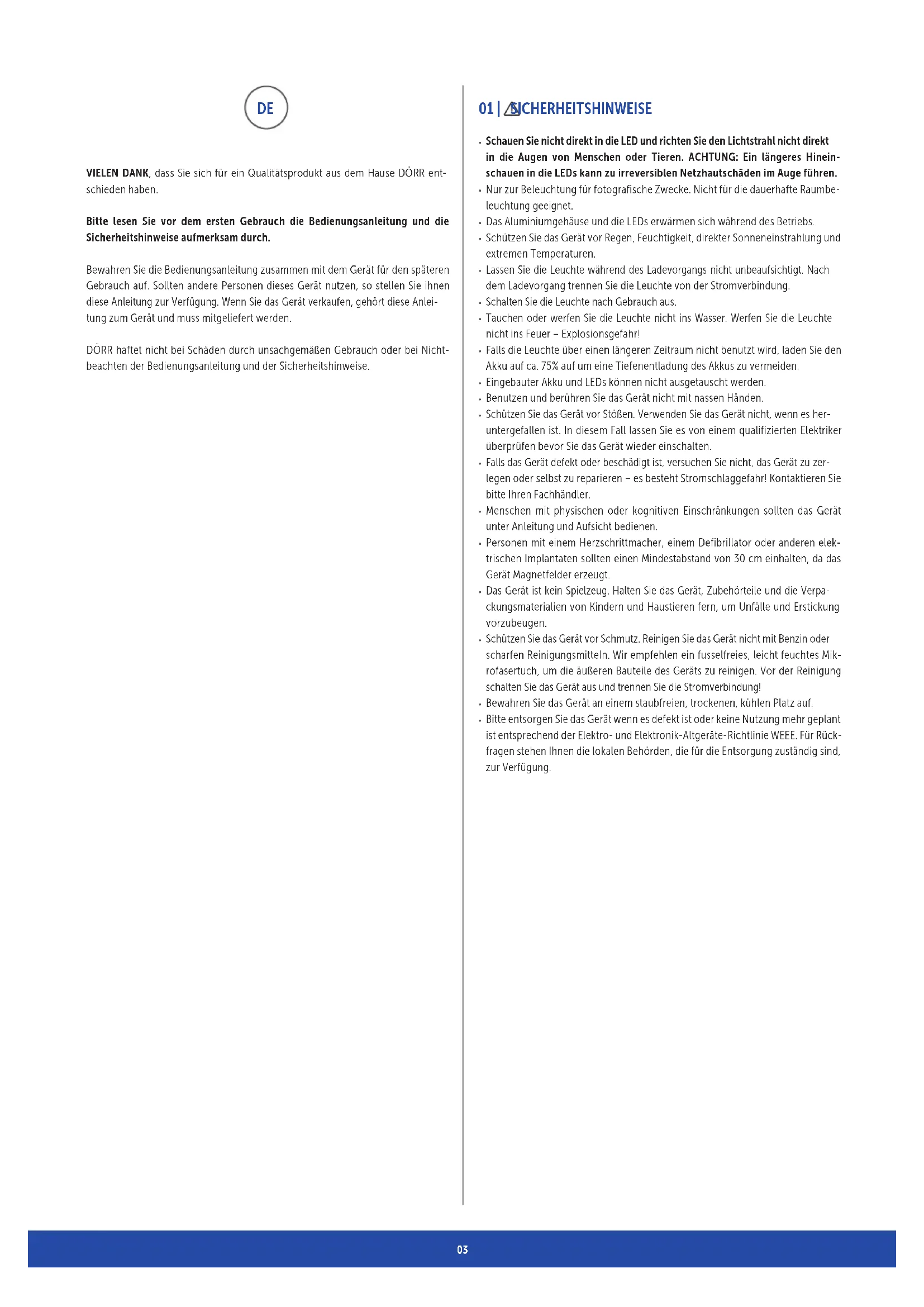 VIELEN DANK, dass Sie sich für ein Qualitätsprodukt aus dem Hause DÖRR ent- schieden haben. Bitte lesen Sie vor dem ersten Gebrauch die Bedienungsanleitung und die Sicherheitshinweise aufmerksam durch. Bewahren Sie die Bedienungsanleitung zusammen mit dem Gerät für den späteren Gebrauch auf. Sollten andere Personen dieses Gerät nutzen, so stellen Sie ihnen diese Anleitung zur Verfügung. Wenn Sie das Gerät verkaufen, gehört diese Anlei- tung zum Gerät und muss mitgeliefert werden. DÖRR haftet nicht bei Schäden durch unsachgemäßen Gebrauch oder bei Nicht- beachten der Bedienungsanleitung und der Sicherheitshinweise. 01 | SICHERHEITSHINWEISE