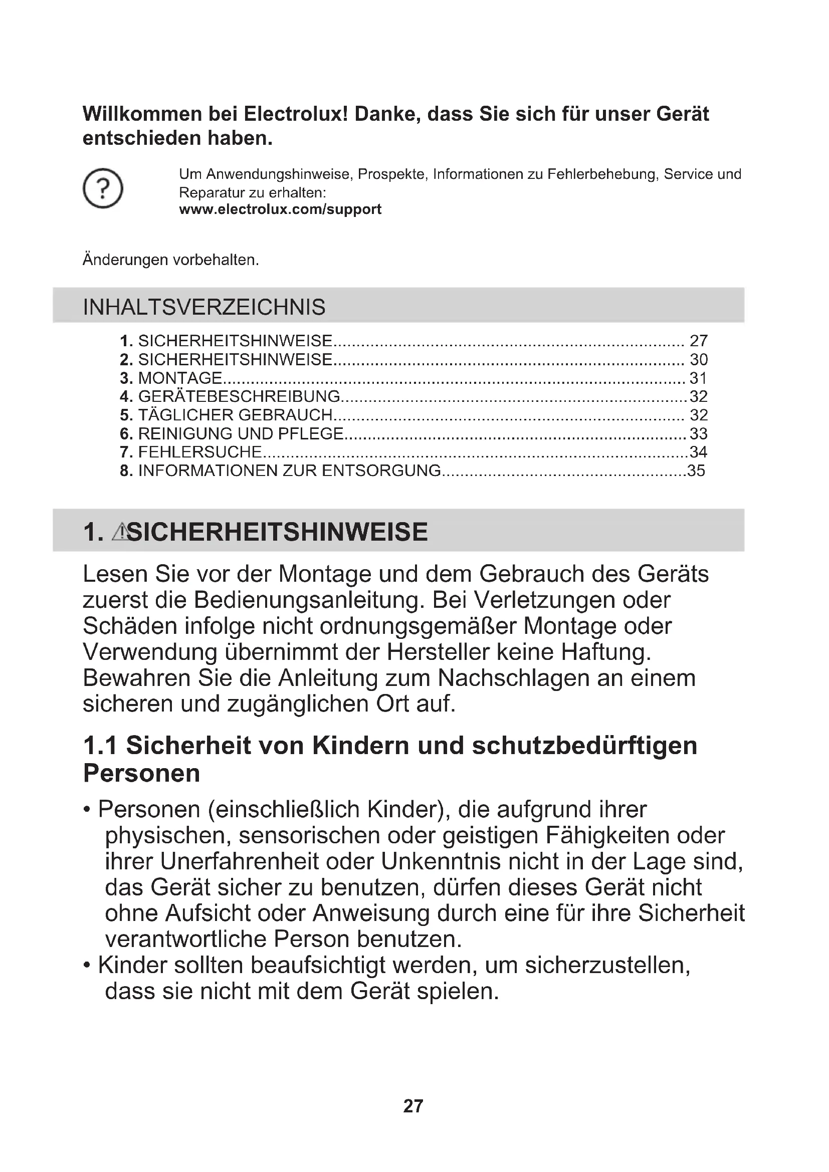 Ihre Pflichten als Endnutzer Dieses Elektro- bzw. Elektronikgerät ist mit einer durchgestrichenen Abfalltonne auf Rädern gekennzeichnet. Das Gerät darf deshalb nur getrennt vom unsortierten Siedlungsabfall gesammelt und zurückgenommen werden, es darf also nicht in den Hausmüll gegeben werden. Das Gerät kann z. B. bei einer kommunalen Sammelstelle oder ggf. bei einem Vertreiber (siehe zu deren Rücknahmepflichten unten) abgegeben werden. Das gilt auch für alle Bauteile, Unterbaugruppen und Verbrauchsmaterialien des zu entsorgenden Altgeräts. Bevor das Altgerät entsorgt werden darf, müssen alle Altbatterien und Altakkumulatoren vom Altgerät getrennt werden, die nicht vom Altgerät umschlossen sind. Das gleiche gilt für Lampen, die zerstörungsfrei aus dem Altgerät entnommen werden können. Der Endnutzer ist zudem selbst dafür verantwortlich, personenbezogene Daten auf dem Altgerät zu löschen. Hinweise zum Recycling Helfen Sie mit, alle Materialien zu recyceln, die mit diesem Symbol gekennzeichnet sind. Entsorgen Sie solche Materialien, insbesondere Verpackungen, nicht im Hausmüll sondern über die bereitgestellten Recyclingbehälter oder die entsprechenden örtlichen Sammelsysteme. Recyceln Sie zum Umwelt- und Gesundheitsschutz auch elektrische und elektronische Geräte. Rücknahmepflichten der Vertreiber in Deutschland Wer auf mindestens 400 m² Verkaufsfläche Elektro- und Elektronikgeräte vertreibt oder sonst geschäftlich an Endnutzer abgibt, ist 35verpflichtet, bei Abgabe eines neuen Geräts ein Altgerät des Endnutzers der gleichen Geräteart, das im Wesentlichen die gleichen Funktionen wie das neue Gerät erfüllt, am Ort der Abgabe oder in unmittelbarer Nähe hierzu unentgeltlich zurückzunehmen. Das gilt auch für Vertreiber von Lebensmitteln mit einer Gesamtverkaufsfläche von mindestens 800 m², die mehrmals im Kalenderjahr oder dauerhaft Elektro- und Elektronikgeräte anbieten und auf dem Markt bereitstellen. Solche Vertreiber müssen zudem auf Verlangen des Endnutzers Altgeräte, die in keiner äußeren Abmessung größer als 25 cm sind (kleine Elektrogeräte), im Einzelhandelsgeschäft oder in unmittelbarer Nähe hierzu unentgeltlich zurückzunehmen; die Rücknahme darf in diesem Fall nicht an den Kauf eines Elektro- oder Elektronikgerätes geknüpft, kann aber auf drei Altgeräte pro Geräteart beschränkt werden. Ort der Abgabe ist auch der private Haushalt, wenn das neue Elektro- oder Elektronikgerät dorthin geliefert wird; in diesem Fall ist die Abholung des Altgerätes für den Endnutzer kostenlos. Die vorstehenden Pflichten gelten auch für den Vertrieb unter Verwendung von Fernkommunikationsmitteln, wenn die Vertreiber Lager- und Versandflächen für Elektro- und Elektronikgeräte bzw. Gesamtlager- und -versandflächen für Lebensmittel vorhalten, die den oben genannten Verkaufsflächen entsprechen. Die unentgeltliche Abholung von Elektro- und Elektronikgeräten ist dann aber auf Wärmeüberträger (z. B. Kühlschrank), Bildschirme, Monitore und Geräte, die Bildschirme mit einer Oberfläche von mehr als 100 cm² enthalten, und Geräte beschränkt, bei denen mindestens eine der äußeren Abmessungen mehr als 50 cm beträgt. Für alle übrigen Elektro- und Elektronikgeräte muss der Vertreiber geeignete Rückgabemöglichkeiten in zumutbarer Entfernung zum jeweiligen Endnutzer gewährleisten; das gilt auch für kleine Elektrogeräte (s.o.), die der Endnutzer zurückgeben will, ohne ein neues Gerät zu kaufen. Rücknahmepflichten von Vertreibern und andere Möglichkeiten der Entsorgung von Elektro- und Elektronikgeräten in der Region Wallonien Vertreiber, die Elektro- und Elektronikgeräte verkaufen, sind verpflichtet, bei der Lieferung von Neugeräten Altgeräte desselben Typs, die im Wesentlichen die gleichen Funktionen wie die Neugeräte erfüllen, kostenlos vom Endverbraucher zurückzunehmen. Dies gilt auch bei der Lieferung von neuen Elektro- und Elektronikgeräten oder beim Fernabsatz. Darüber hinaus ist jeder, der Elektro- und Elektronikgeräte auf einer Verkaufsfläche von mindestens 400 m² verkauft, verpflichtet, Altgeräte, die in keiner äußeren Abmessung größer als 25 cm sind (Elektrokleingeräte), im Ladengeschäft oder in unmittelbarer Nähe kostenlos zurückzunehmen; die Rücknahme darf in diesem Fall nicht vom Kauf eines Elektro- oder Elektronikgerätes abhängig gemacht werden. Die Rücknahme von Elektro- und Elektronikgeräten kann auch auf Containerplätzen oder zugelassenen Recyclinghöfen erfolgen. Für weitere Informationen wenden Sie sich bitte an Ihre Gemeindeverwaltung. 36Καλωσορίσατε στην Electrolux! Ευχαριστούμε που επιλέξατε τη συσκευή μας. Βρείτε υποδείξεις χρήσης, φυλλάδια, συμβουλές για την επίλυση προβλημάτων,πληροφορίες σέρβις και επισκευής:www.electrolux.com/supportΥπόκειται αε αλλαγές χωρίς προειδποίηση. ΠΕΡΙΕΧΟΜΕΝΑ