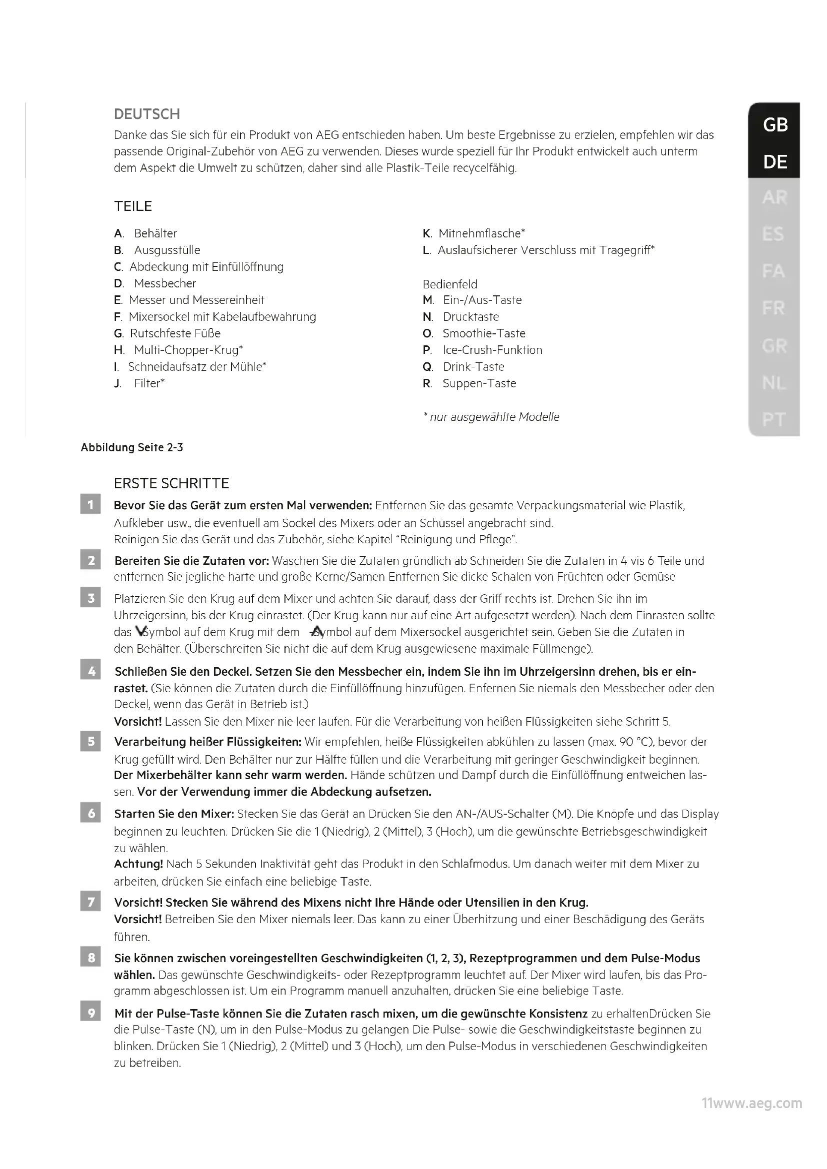 DEUTSCH Danke das Sie sich für ein Produkt von AEG entschieden haben. Um beste Ergebnisse zu erzielen, empfehlen wir das passende Original-Zubehör von AEG zu verwenden. Dieses wurde speziell für Ihr Produkt entwickelt auch unterm dem Aspekt die Umwelt zu schützen, daher sind alle Plastik-Teile recycelfähig. TEILE A. Behälter B. Ausgusstülle C. Abdeckung mit Einfüllönung D. Messbecher E. Messer und Messereinheit F. Mixersockel mit Kabelaufbewahrung G. Rutschfeste Füße H. Multi-Chopper-Krug*