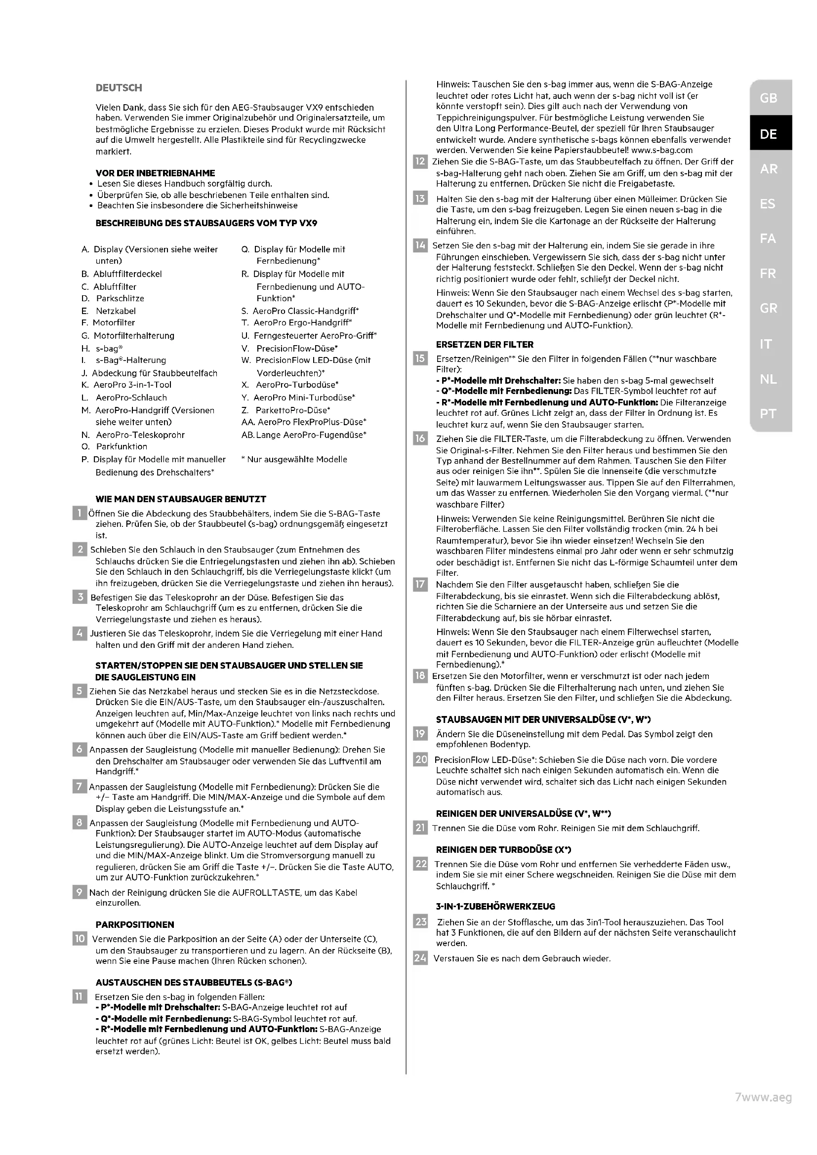 PT9www.aeg.com SICHERHEITSHINWEISE Das Gerät kann von Kindern ab 8 Jahren und Personen mit eingeschränkten physischen, sensorischen oder geistigen Fähigkeiten oder mit mangelnder Erfahrung und/oder mangelndem Wissen nur dann verwendet werden, wenn sie durch eine für ihre Sicherheit zuständige Person beaufsichtigt werden oder in die sichere Verwendung des Geräts eingewiesen wurden und die mit dem Gerät verbundenen Gefahren verstanden haben. Kinder dürfen nicht mit dem Gerät spielen. Reinigung und Wartung des Geräts dürfen nicht von Kindern ohne Aufsicht erfolgen. WARNUNG: Turbodüsen* besitzen eine rotierende Bürste, in der sich Teile festsetzen können. Verwenden Sie die Düsen vorsichtig und nur auf den dafür vorgesehenen Oberächen. Schalten Sie den Staubsauger aus, bevor Sie festsitzende Teile entfernen oder die Bürsten reinigen. Die Akkus müssen aus der Fernbedienung im Gri*/der LED beleuchteten Düse* entfernt werden, bevor Sie das Produkt verschrotten**. *Nur ausgewählte Modelle. **Informationen darüber, wie Sie den Akku aus dem ausklappbaren Teil von Abschnitt 25 und 26 entfernen. Ziehen Sie immer den Stecker aus der Netzsteckdose, bevor Sie das Gerät reinigen oder warten oder wenn Sie den Akku herausnehmen. Die Akkus müssen sicher entsorgt werden. Wenn das Kabel beschädigt ist, muss es durch einen autorisierten AEG-Kundendienst ersetzt werden, um Gefahrenquellen zu vermeiden. VX9 darf nur für normales Staubsaugen im Innenbereich und in einer Haushaltsumgebung verwendet werden. Staubsauger immer an einem trockenen Ort aufbewahren. Alle Wartungs- und Reparaturarbeiten dürfen ausschließlich von einem autorisierten AEG-Kundendienst durchgeführt werden. Verpackungsmaterial wie Plastikbeutel u. ä. von Kindern fernhalten. Es besteht Erstickungsgefahr. Benutzen Sie den Staubsauger niemals ...
