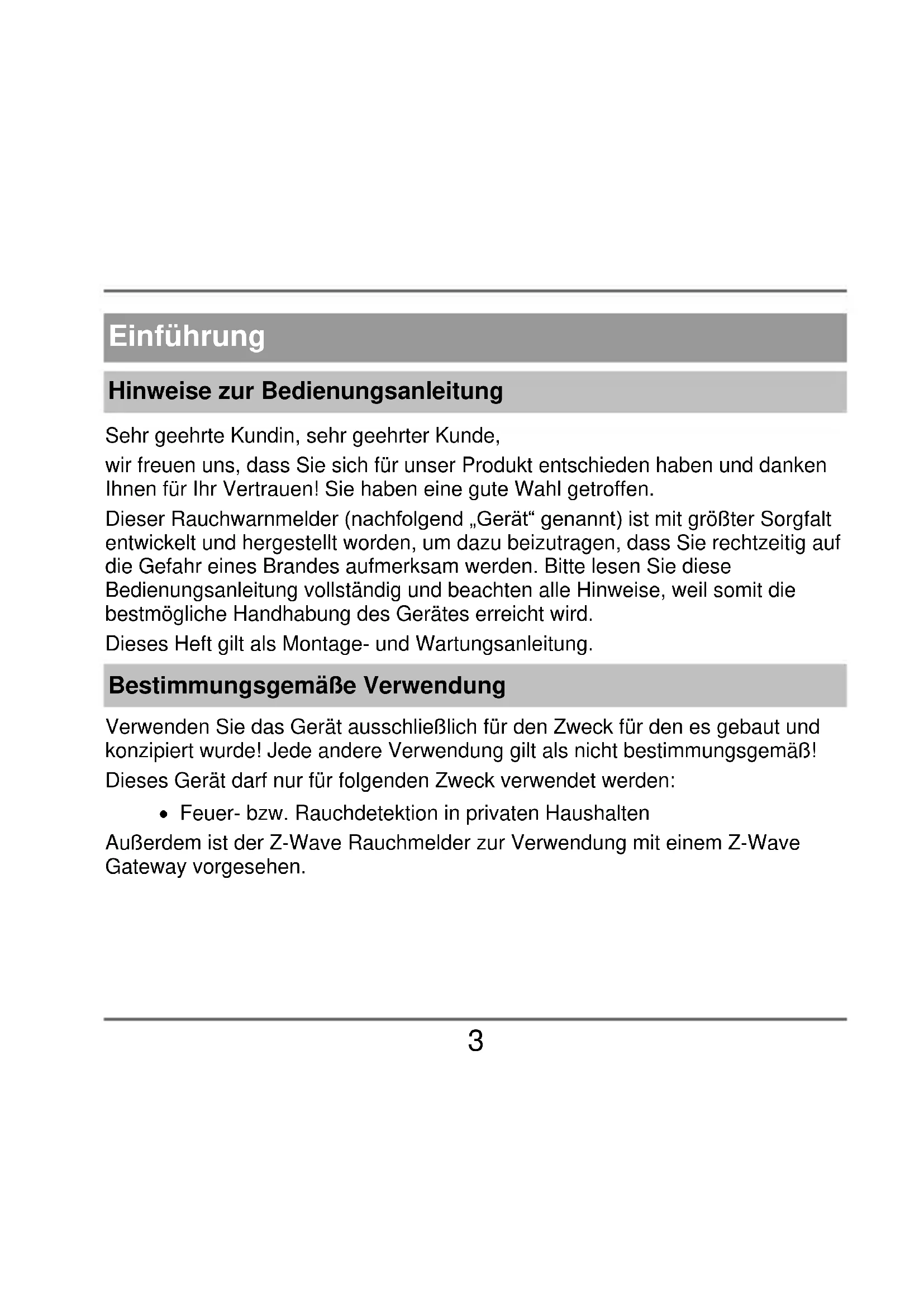 - Leistungserklärung Einführung Hinweise zur Bedienungsanleitung Sehr geehrte Kundin, sehr geehrter Kunde, wir freuen uns, dass Sie sich für unser Produkt entschieden haben und danken Ihnen für Ihr Vertrauen! Sie haben eine gute Wahl getroffen. Dieser Rauchwarnmelder (nachfolgend „Gerät“ genannt) ist mit größter Sorgfalt entwickelt und hergestellt worden, um dazu beizutragen, dass Sie rechtzeitig auf die Gefahr eines Brandes aufmerksam werden. Bitte lesen Sie diese Bedienungsanleitung vollständig und beachten alle Hinweise, weil somit die bestmögliche Handhabung des Gerätes erreicht wird. Dieses Heft gilt als Montage- und Wartungsanleitung. Bestimmungsgemäße Verwendung Verwenden Sie das Gerät ausschließlich für den Zweck für den es gebaut und konzipiert wurde! Jede andere Verwendung gilt als nicht bestimmungsgemäß! Dieses Gerät darf nur für folgenden Zweck verwendet werden: Feuer- bzw. Rauchdetektion in privaten Haushalten Außerdem ist der Z-Wave Rauchmelder zur Verwendung mit einem Z-Wave Gateway vorgesehen.4 Haftungsbeschränkung Ihre Rechte beschränken sich auf die Reparatur oder den Ersatz dieses Produktes im Lieferzustand. ABUS Security Center übernimmt keine Haftung für jegliche spezielle, beiläufig entstandene oder Folgeschäden, inklusive, aber nicht beschränkt auf entstandene Ertragseinbußen, Gewinneinbußen, Einschränkungen bei der Verwendung der Software, Verlust oder Wiederherstellung von Daten, Kosten für Ersatzeinrichtungen, Ausfallzeiten, Sachschäden und Forderungen Dritter, infolge von u.a. aus der Gewährleistung erwachsenden, vertraglichen, gesetzlichen oder schadenersatzrechtlichen Wiederherstellungsansprüchen ungeachtet anderer beschränkter oder per Gesetz implizierter Gewährleistungsbestimmungen oder für den Fall, dass die beschränkte Gewährleistung nicht gilt, beschränkt sich der Haftungsumfang von ABUS Security Center auf den Kaufpreis des Produktes. Der Inhalt dieser Anleitung kann ohne vorherige Bekanntgabe geändert werden. © ABUS Security-Center GmbH & Co. KG, 10/20185 Sicherheitshinweise Symbolerklärung Folgende Symbole werden in der Anleitung bzw. auf dem Gerät verwendet: Symbol Signalwort Bedeutung p. 263