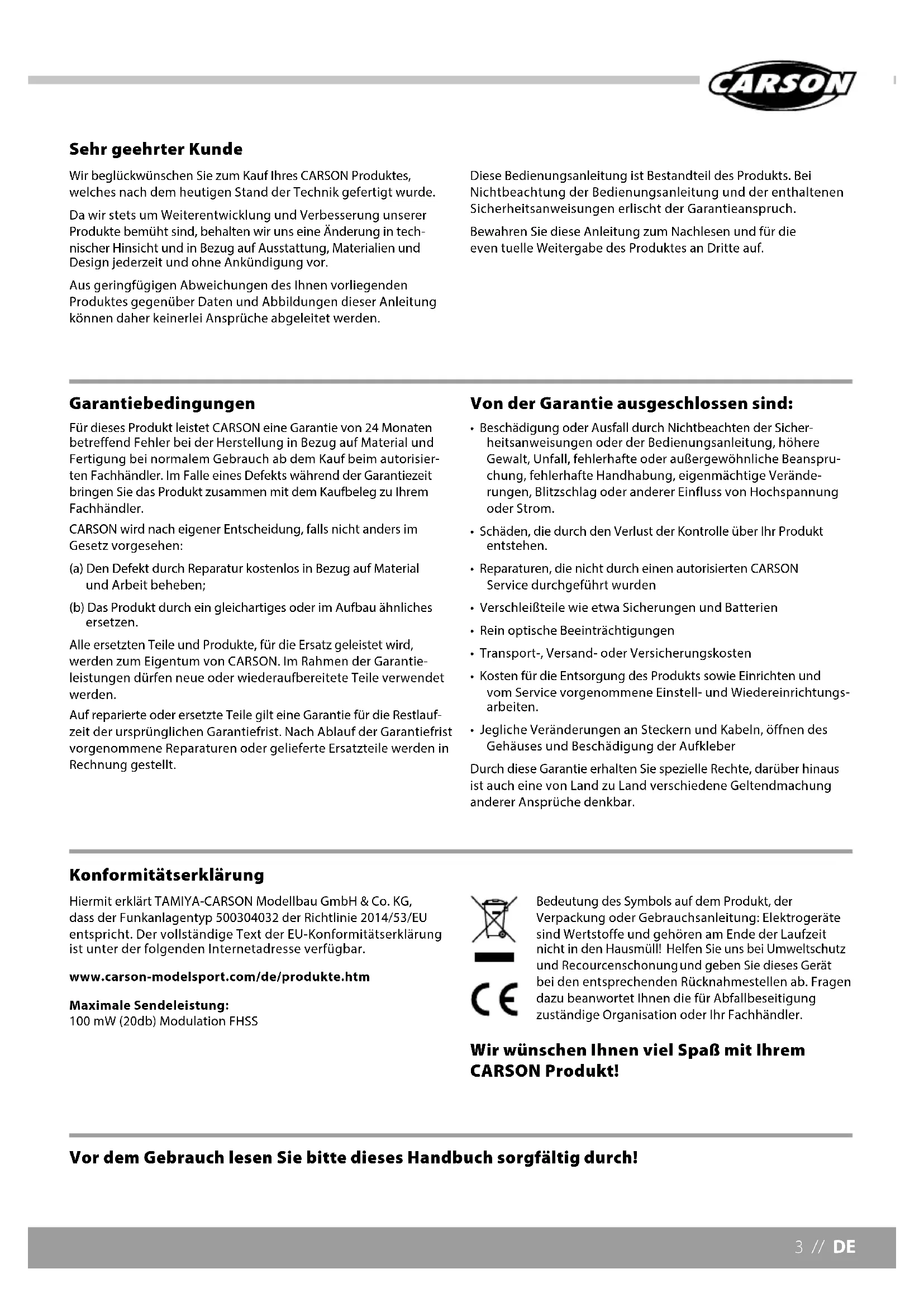 - Jegliche Veränderungen an Steckern und Kabeln, öffnen des Gehäuses und Beschädigung der Aufkleber Durch diese Garantie erhalten Sie spezielle Rechte, darüber hinaus ist auch eine von Land zu Land verschiedene Geltendmachung anderer Ansprüche denkbar. Vor dem Gebrauch lesen Sie bitte dieses Handbuch sorgfältig durch! Hiermit erklärt TAMIYA-CARSON Modellbau GmbH & Co. KG, dass der Funkanlagentyp 500304032 der Richtlinie 2014/53/EU entspricht. Der vollständige Text der EU-Konformitätserklärung ist unter der folgenden Internetadresse verfügbar. www.carson-modelsport.com/de/produkte.htm Maximale Sendeleistung: 100 mW (20db) Modulation FHSS Bedeutung des Symbols auf dem Produkt, der Verpackung oder Gebrauchsanleitung: Elektrogeräte sind Wertstoffe und gehören am Ende der Laufzeit nicht in den Hausmüll! Helfen Sie uns bei Umweltschutz und Recourcenschonung und geben Sie dieses Gerät bei den entsprechenden Rücknahmestellen ab. Fragen dazu beanwortet Ihnen die für Abfallbeseitigung zuständige Organisation oder Ihr Fachhändler. Wir wünschen Ihnen viel Spaß mit Ihrem CARSON Produkt! KonformitätserklärungDE // 4