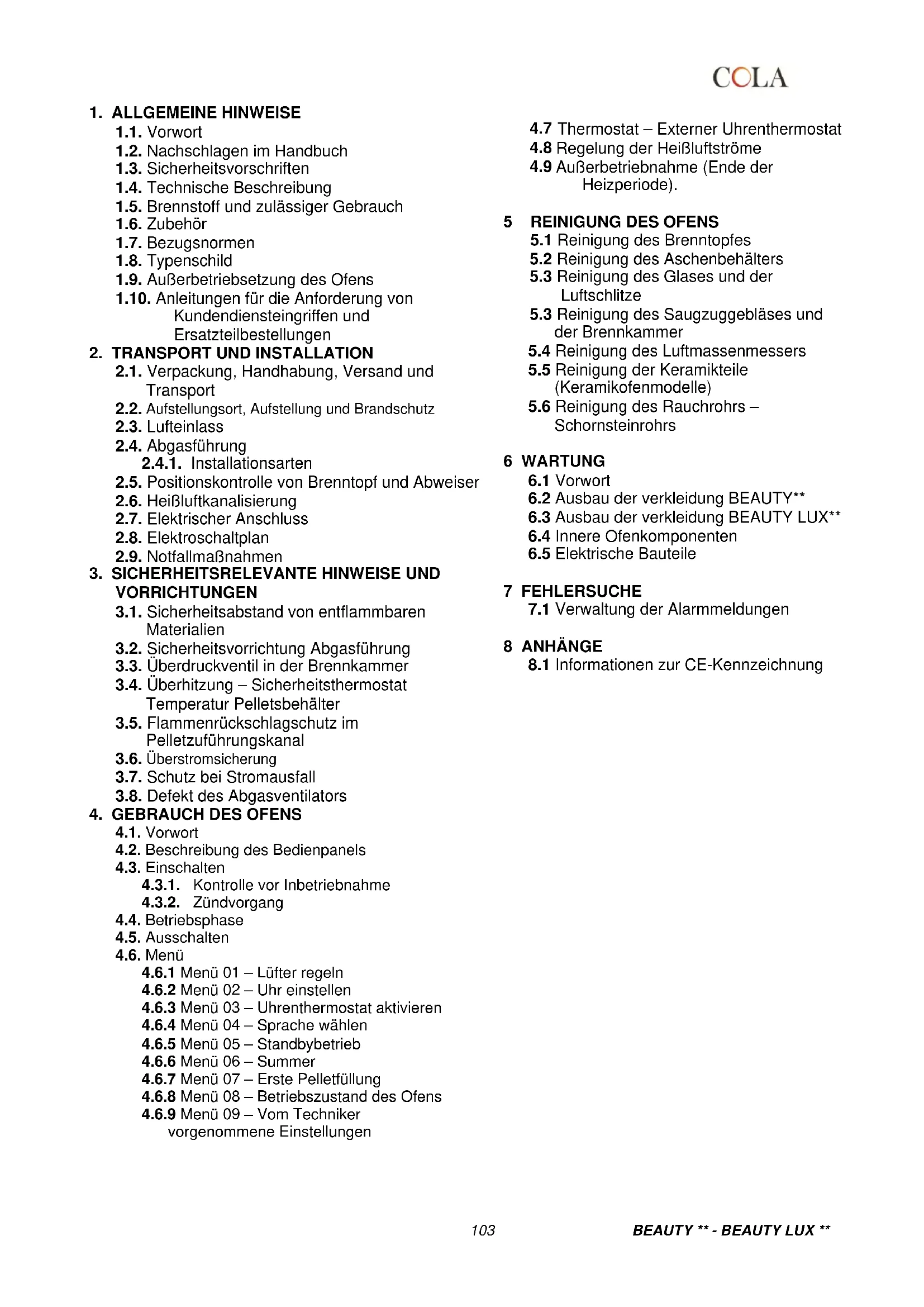 - Vor Installation, Benutzung oder Wartung des Pelletofens die Bedienungs- und Wartungsanleitung lesen. - Die Installation, den elektrischen Anschluss, die Abnahme und Wartung nur von autorisiertem Fachpersonal ausführen lassen. - Den Ofen über ein inspizierbares Endstück an ein vorschriftsmäßiges Schornsteinrohr anschließen; der Anschluss mehrerer Geräte ist nur zulässig, wenn er von den örtlichen Bestimmungen vorgesehen ist und vom Schornsteinfeger genehmigt wurde. - Den Ofen über ein Rohr bzw. einen Außenlufteinlass an den Saugzug anschließen. - Den Ofen an eine vorschriftsmäßige Steckdose mit Spannungswerten 230 V - 50 Hz anschließen. - Die elektrische Anlage und die Steckdosen müssen für die maximale Stromaufnahme des Geräts geeignet sein, die auf dem Etikett und im vorliegenden Handbuch angegeben ist. - Vor jeder Wartung den Stecker aus dem Ofen ziehen und nur am kaltem Ofen Eingriffe vornehmen. - Keine entflammbaren Flüssigkeiten oder Substanzen verwenden, um den Ofen anzuzünden bzw. die Flamme wieder anzufachen: Bei eingeschaltetem Ofen erfolgt das Anzünden der Pellets automatisch. - Der Pelletofen darf ausschließlich mit Pellets beschickt werden, die die in dieser Anleitung beschriebenen Eigenschaften aufweisen. - Der Ofen darf nicht zur Müllverbrennung verwendet werden. - Die Ein- und Auslassöffnungen für die Verbrennungsluft auf keinen Fall schließen oder verdecken. - Während des Ofenbetriebs ist der Umgang mit leicht entflammbaren oder explosiven Stoffen in der Nähe des Ofens untersagt. - Das Schutzgitter des Pelletsbehälters und im Allgemeinen die Sicherheitseinrichtungen nicht entfernen oder verändern. - Der Ofen darf nicht mit offener Feuerraumtür und/oder mit beschädigter oder zerbrochener Glasscheibe betrieben werden. - Während des Betriebs heizt die von der Pelletverbrennung erzeugte intensive Wärme die Außenflächen des Ofens stark auf. Dies gilt besonders für die Feuerraumtür, den Griff und das Rauchrohr. Vermeiden Sie daher jede Berührung mit diesen Teilen ohne entsprechende Schutzausrüstung - Bewahren Sie nicht hitzefeste und/oder entflammbare Gegenstände in ausreichendem Sicherheitsabstand zum Ofen auf. - Den Brenntopf bei jedem Anzünden bzw. Nachfüllen von Pellets reinigen. - Das Rauchrohr und die Zugstabilisatoren in der Brennkammer regelmäßig von einem Fachmann reinigen lassen. - Während des Zündvorgangs und/oder beim normalen Betrieb die Bildung von Rauch und unverbrannten Stoffen vermeiden, die übermäßige Ansammlung von unverbrannten Pellets im Brenntopf muss vor dem erneuten Einschalten von Hand beseitigt werden. - Weisen Sie Kinder und Besucher auf die oben beschriebenen Gefahren hin. - Bei Betriebsstörungen darf der Ofen erst nach Behebung der Problemursache wieder angezündet werden. - Jegliche Änderung und/oder jegliches nicht zulässige Auswechseln mit nicht Original-Ersatzteilen des Ofens ist eine Gefahr für die Benutzer und enthebt den Hersteller von jeder Haftpflicht und strafrechtlichen Verantwortungen. - Ausschließlich die vom Hersteller empfohlenen Ersatzteile benutzen. Der Hersteller haftet nicht für Störungen, Schäden oder Unfälle, die auf die Missachtung bzw. Nichteinhaltung der Hinweise in der Betriebsanleitung zurückzuführen sind.105 BEAUTY ** - BEAUTY LUX **