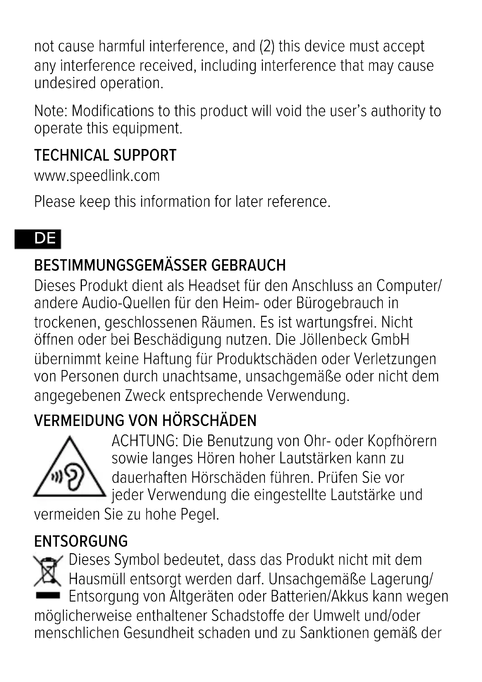 Dieses Produkt dient als Headset für den Anschluss an Computer/ andere Audio-Quellen für den Heim- oder Bürogebrauch in trockenen, geschlossenen Räumen. Es ist wartungsfrei. Nicht önen oder bei Beschädigung nutzen. Die Jöllenbeck GmbH übernimmt keine Haftung für Produktschäden oder Verletzungen von Personen durch unachtsame, unsachgemäße oder nicht dem angegebenen Zweck entsprechende Verwendung.