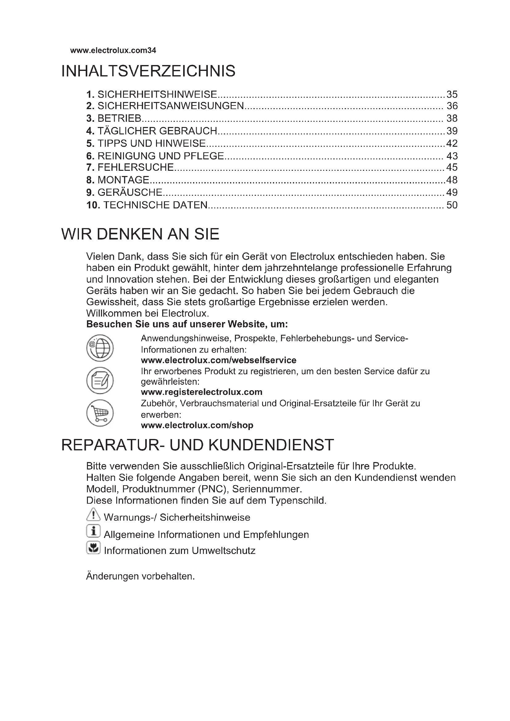 Bitte verwenden Sie ausschließlich Original-Ersatzteile für Ihre Produkte. Halten Sie folgende Angaben bereit, wenn Sie sich an den Kundendienst wenden Modell, Produktnummer (PNC), Seriennummer. Diese Informationen finden Sie auf dem Typenschild. Warnungs-/ Sicherheitshinweise Allgemeine Informationen und Empfehlungen Informationen zum Umweltschutz Änderungen vorbehalten. www.electrolux.com341. SICHERHEITSHINWEISE Lesen Sie die mitgelieferte Gebrauchsanleitung sorgfältig vor Montage und Inbetriebnahme des Geräts. Bei Verletzungen oder Schäden infolge nicht ordnungsgemäßer Montage oder Verwendung des Geräts übernimmt der Hersteller keine Haftung. Bewahren Sie die Anleitung immer an einem sicheren und zugänglichen Ort zum späteren Nachschlagen auf.