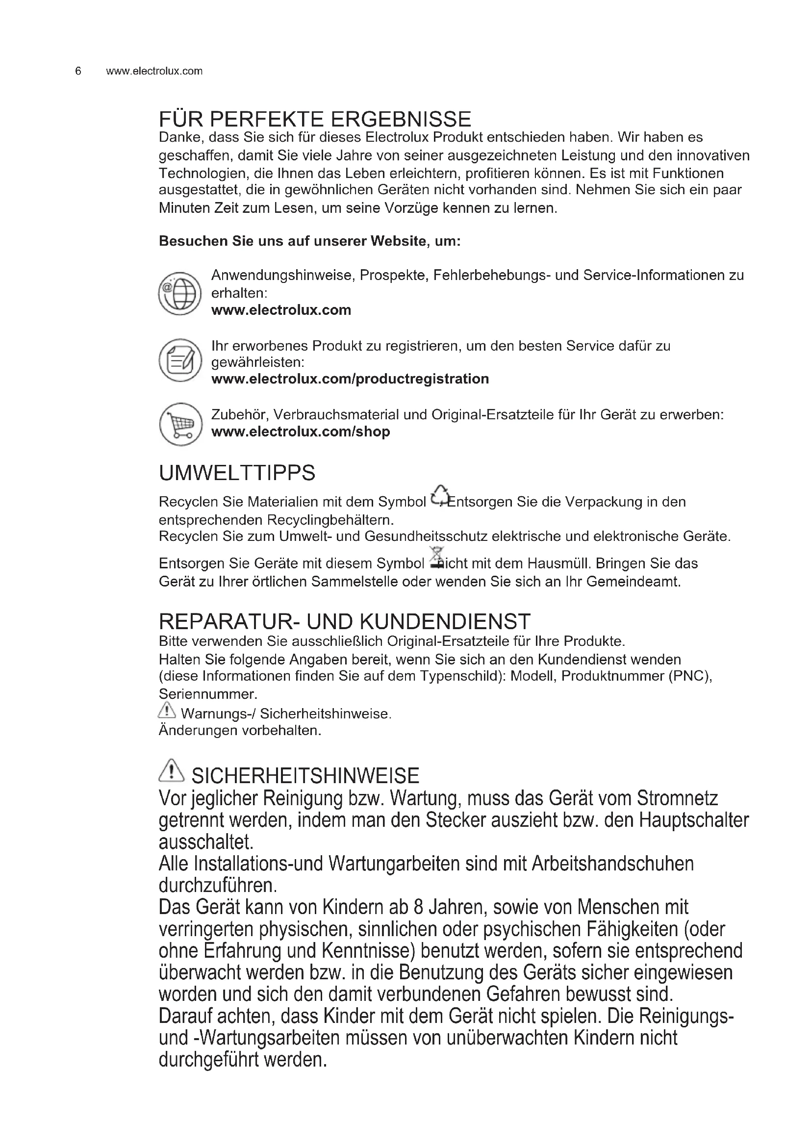 Danke, dass Sie sich für dieses Electrolux Produkt entschieden haben Wir haben es geschaffen, damit Sie viele Jahre von seiner ausgezeichneten Leistung und den innovativen Technologien, die Ihnen das Leben erleichtern, protieren können. Es ist mit Funktionen ausgestattet, die in gewöhnlichen Geräten nicht vorhanden sind. Nehmen Sie sich ein paar Minuten Zeit zum Lesen, um seine Vorzüge kennen zu lernen Besuchen Sie uns auf unserer Website, um: Anwendungshinweise, Prospekte, Fehlerbehebungs- und Service-Informationen zu erhalten: www.electrolux.com Ihr erworbenes Produkt zu registrieren, um den besten Service dafür zu gewährleisten: www.electrolux.com/productregistration Zubehör, Verbrauchsmaterial und Original-Ersatzteile für Ihr Gerät zu erwerben: www.electrolux.com/shop UMWELTTIPPS Recyclen Sie Materialien mit dem Symbol Entsorgen Sie die Verpackung in den entsprechenden Recyclingbehältern. Recyclen Sie zum Umwelt- und Gesundheitsschutz elektrische und elektronische Geräte. Entsorgen Sie Geräte mit diesem Symbol nicht mit dem Hausmüll Bringen Sie das Gerät zu Ihrer örtlichen Sammelstelle oder wenden Sie sich an Ihr Gemeindeamt.
