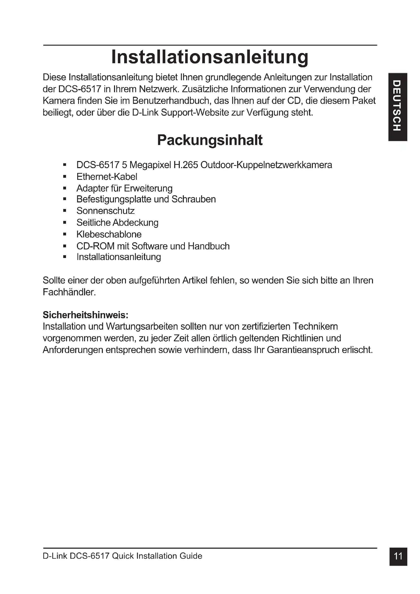 DEUTSCH Installationsanleitung Diese Installationsanleitung bietet Ihnen grundlegende Anleitungen zur Installation der DCS-6517 in Ihrem Netzwerk. Zusätzliche Informationen zur Verwendung der Kamera finden Sie im Benutzerhandbuch, das Ihnen auf der CD, die diesem Paket beiliegt, oder über die D-Link Support-Website zur Verfügung steht. Packungsinhalt DCS-6517 5 Megapixel H.265 Outdoor-Kuppelnetzwerkkamera Ethernet-Kabel Adapter für Erweiterung Befestigungsplatte und Schrauben Sonnenschutz Seitliche Abdeckung Klebeschablone CD-ROM mit Software und Handbuch Installationsanleitung Sollte einer der oben aufgeführten Artikel fehlen, so wenden Sie sich bitte an Ihren Fachhändler. Sicherheitshinweis: Installation und Wartungsarbeiten sollten nur von zertifizierten Technikern vorgenommen werden, zu jeder Zeit allen örtlich geltenden Richtlinien und Anforderungen entsprechen sowie verhindern, dass Ihr Garantieanspruch erlischt.D-Link DCS-6517 Quick Installation Guide