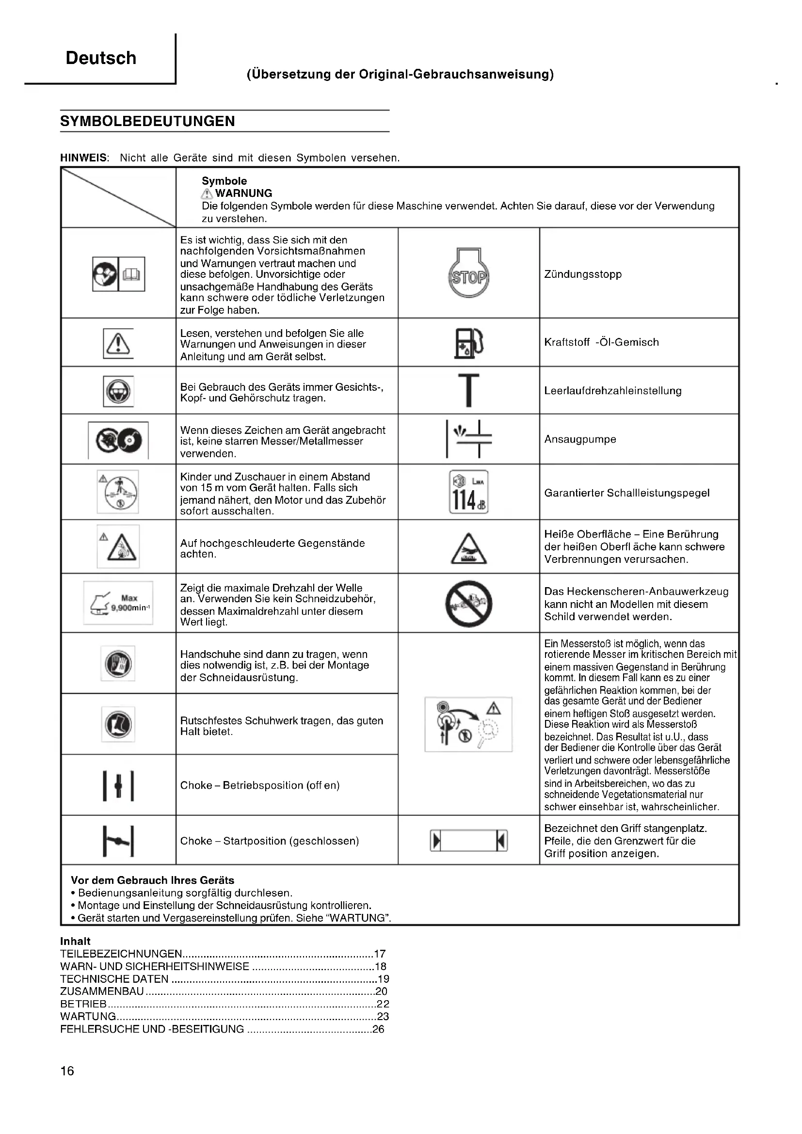 (Übersetzung der Original-Gebrauchsanweisung) SYMBOLBEDEUTUNGEN HINWEIS: Nicht alle Geräte sind mit diesen Symbolen versehen. Symbole WARNUNG Die folgenden Symbole werden für diese Maschine verwendet. Achten Sie darauf, diese vor der Verwendung zu verstehen. Es ist wichtig, dass Sie sich mit den nachfolgenden Vorsichtsmaßnahmen und Warnungen vertraut machen und diese befolgen. Unvorsichtige oder unsachgemäße Handhabung des Geräts kann schwere oder tödliche Verletzungen zur Folge haben. Zündungsstopp Lesen, verstehen und befolgen Sie alle Warnungen und Anweisungen in dieser Anleitung und am Gerät selbst. Kraftstoff -Öl-Gemisch Bei Gebrauch des Geräts immer Gesichts-, Kopf- und Gehörschutz tragen. Leerlaufdrehzahleinstellung Wenn dieses Zeichen am Gerät angebracht ist, keine starren Messer/Metallmesser verwenden. Ansaugpumpe Kinder und Zuschauer in einem Abstand von 15 m vom Gerät halten. Falls sich jemand nähert, den Motor und das Zubehör sofort ausschalten.