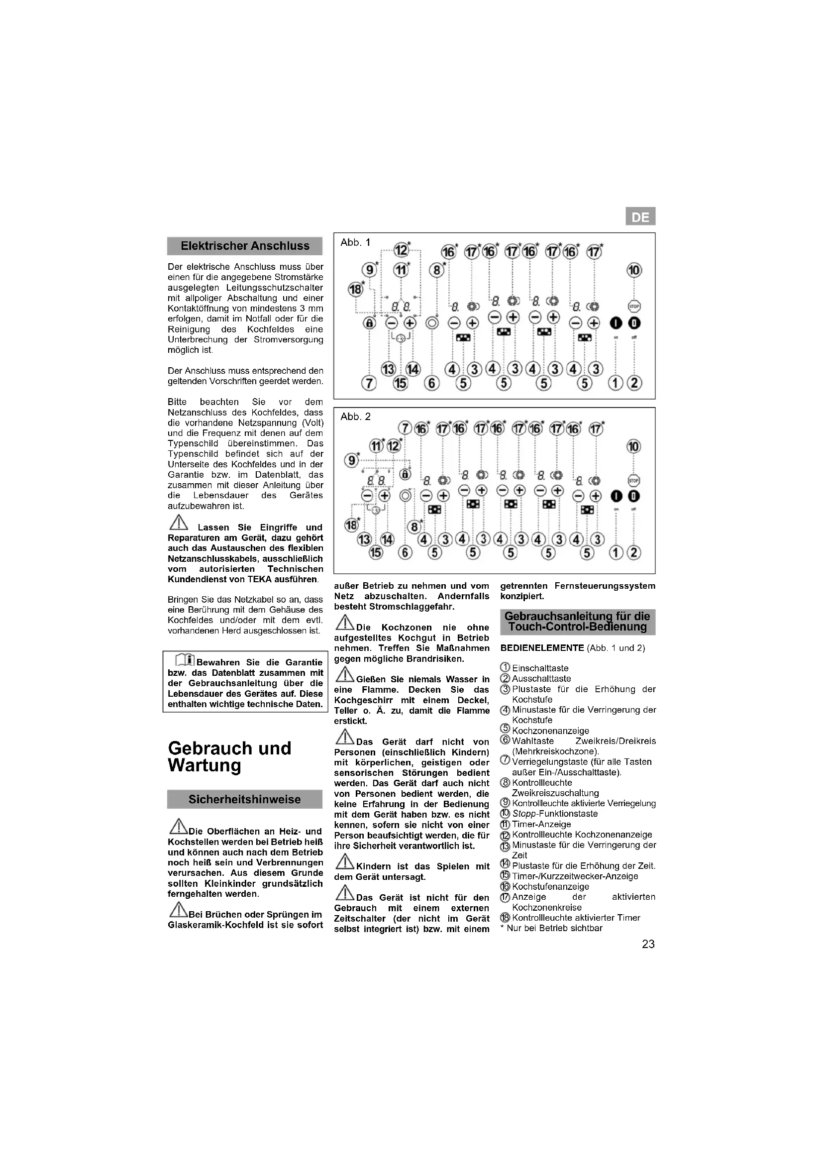 Elektrischer Anschluss Der elektrische Anschluss muss über einen für die angegebene Stromstärke ausgelegten Leitungsschutzschalter mit allpoliger Abschaltung und einer Kontaktöffnung von mindestens 3 mm erfolgen, damit im Notfall oder für die Reinigung des Kochfeldes eine Unterbrechung der Stromversorgung möglich ist. Der Anschluss muss entsprechend den geltenden Vorschriften geerdet werden. Bitte beachten Sie vor dem Netzanschluss des Kochfeldes, dass die vorhandene Netzspannung (Volt) und die Frequenz mit denen auf dem Typenschild übereinstimmen. Das Typenschild befindet sich auf der Unterseite des Kochfeldes und in der Garantie bzw. im Datenblatt, das zusammen mit dieser Anleitung über die Lebensdauer des Gerätes aufzubewahren ist. Lassen Sie Eingriffe und Reparaturen am Gerät, dazu gehört auch das Austauschen des flexiblen Netzanschlusskabels, ausschließlich vom autorisierten Technischen Kundendienst von TEKA ausführen. Bringen Sie das Netzkabel so an, dass eine Berührung mit dem Gehäuse des Kochfeldes und/oder mit dem evtl. vorhandenen Herd ausgeschlossen ist. Bewahren Sie die Garantie bzw. das Datenblatt zusammen mit der Gebrauchsanleitung über die Lebensdauer des Gerätes auf. Diese enthalten wichtige technische Daten. Gebrauch und Wartung Sicherheitshinweise Die Oberflächen an Heiz- und Kochstellen werden bei Betrieb heiß und können auch nach dem Betrieb noch heiß sein und Verbrennungen verursachen. Aus diesem Grunde sollten Kleinkinder grundsätzlich ferngehalten werden. Bei Brüchen oder Sprüngen im Glaskeramik-Kochfeld ist sie sofort außer Betrieb zu nehmen und vom Netz abzuschalten. Andernfalls besteht Stromschlaggefahr. Die Kochzonen nie ohne aufgestelltes Kochgut in Betrieb nehmen. Treffen Sie Maßnahmen gegen mögliche Brandrisiken. Gießen Sie niemals Wasser in eine Flamme. Decken Sie das Kochgeschirr mit einem Deckel, Teller o. Ä. zu, damit die Flamme erstickt. Das Gerät darf nicht von Personen (einschließlich Kindern) mit körperlichen, geistigen oder sensorischen Störungen bedient werden. Das Gerät darf auch nicht von Personen bedient werden, die keine Erfahrung in der Bedienung mit dem Gerät haben bzw. es nicht kennen, sofern sie nicht von einer Person beaufsichtigt werden, die für ihre Sicherheit verantwortlich ist. Kindern ist das Spielen mit dem Gerät untersagt. Das Gerät ist nicht für den Gebrauch mit einem externen Zeitschalter (der nicht im Gerät selbst integriert ist) bzw. mit einem getrennten Fernsteuerungssystem konzipiert. Gebrauchsanleitung für die Touch-Control-Bedienung BEDIENELEMENTE (Abb. 1 und 2) Einschalttaste Ausschalttaste Plustaste für die Erhöhung der Kochstufe Minustaste für die Verringerung der Kochstufe Kochzonenanzeige Wahltaste Zweikreis/Dreikreis (Mehrkreiskochzone). Verriegelungstaste (für alle Tasten außer Ein-/Ausschalttaste). Kontrollleuchte Zweikreiszuschaltung Kontrollleuchte aktivierte Verriegelung Stopp-Funktionstaste Timer-Anzeige Kontrollleuchte Kochzonenanzeige Minustaste für die Verringerung der Zeit Plustaste für die Erhöhung der Zeit. Timer-/Kurzzeitwecker-Anzeige Kochstufenanzeige Anzeige der aktivierten Kochzonenkreise Kontrollleuchte aktivierter Timer