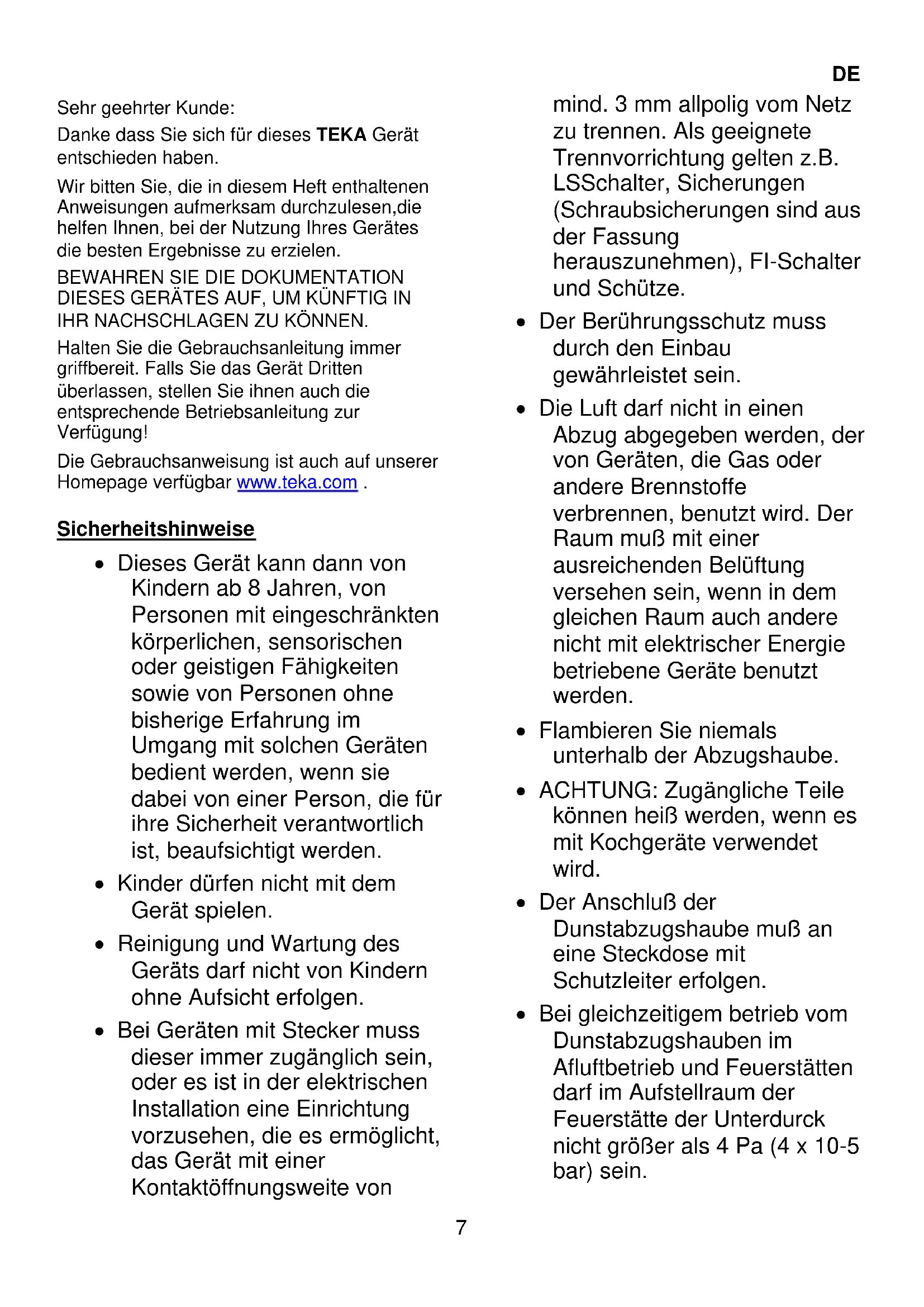 DIESES GERÄTES AUF, UM KÜNFTIG IN IHR NACHSCHLAGEN ZU KÖNNEN. Halten Sie die Gebrauchsanleitung immer griffbereit. Falls Sie das Gerät Dritten überlassen, stellen Sie ihnen auch die entsprechende Betriebsanleitung zur Verfügung! Die Gebrauchsanweisung ist auch auf unserer Homepage verfügbar www.teka.com . Sicherheitshinweise Dieses Gerät kann dann von Kindern ab 8 Jahren, von Personen mit eingeschränkten körperlichen, sensorischen oder geistigen Fähigkeiten sowie von Personen ohne bisherige Erfahrung im Umgang mit solchen Geräten bedient werden, wenn sie dabei von einer Person, die für ihre Sicherheit verantwortlich ist, beaufsichtigt werden. Kinder dürfen nicht mit dem Gerät spielen. Reinigung und Wartung des Geräts darf nicht von Kindern ohne Aufsicht erfolgen. Bei Geräten mit Stecker muss dieser immer zugänglich sein, oder es ist in der elektrischen Installation eine Einrichtung vorzusehen, die es ermöglicht, das Gerät mit einer Kontaktöffnungsweite von mind. 3 mm allpolig vom Netz zu trennen. Als geeignete Trennvorrichtung gelten z.B. LSSchalter, Sicherungen (Schraubsicherungen sind aus der Fassung herauszunehmen), FI-Schalter und Schütze. Der Berührungsschutz muss durch den Einbau gewährleistet sein. Die Luft darf nicht in einen Abzug abgegeben werden, der von Geräten, die Gas oder andere Brennstoffe verbrennen, benutzt wird. Der Raum muß mit einer ausreichenden Belüftung versehen sein, wenn in dem gleichen Raum auch andere nicht mit elektrischer Energie betriebene Geräte benutzt werden. Flambieren Sie niemals unterhalb der Abzugshaube. ACHTUNG: Zugängliche Teile können heiß werden, wenn es mit Kochgeräte verwendet wird. Der Anschluß der Dunstabzugshaube muß an eine Steckdose mit Schutzleiter erfolgen. Bei gleichzeitigem betrieb vom Dunstabzugshauben im Afluftbetrieb und Feuerstätten darf im Aufstellraum der Feuerstätte der Unterdurck nicht größer als 4 Pa (4 x 10-5 bar) sein.8