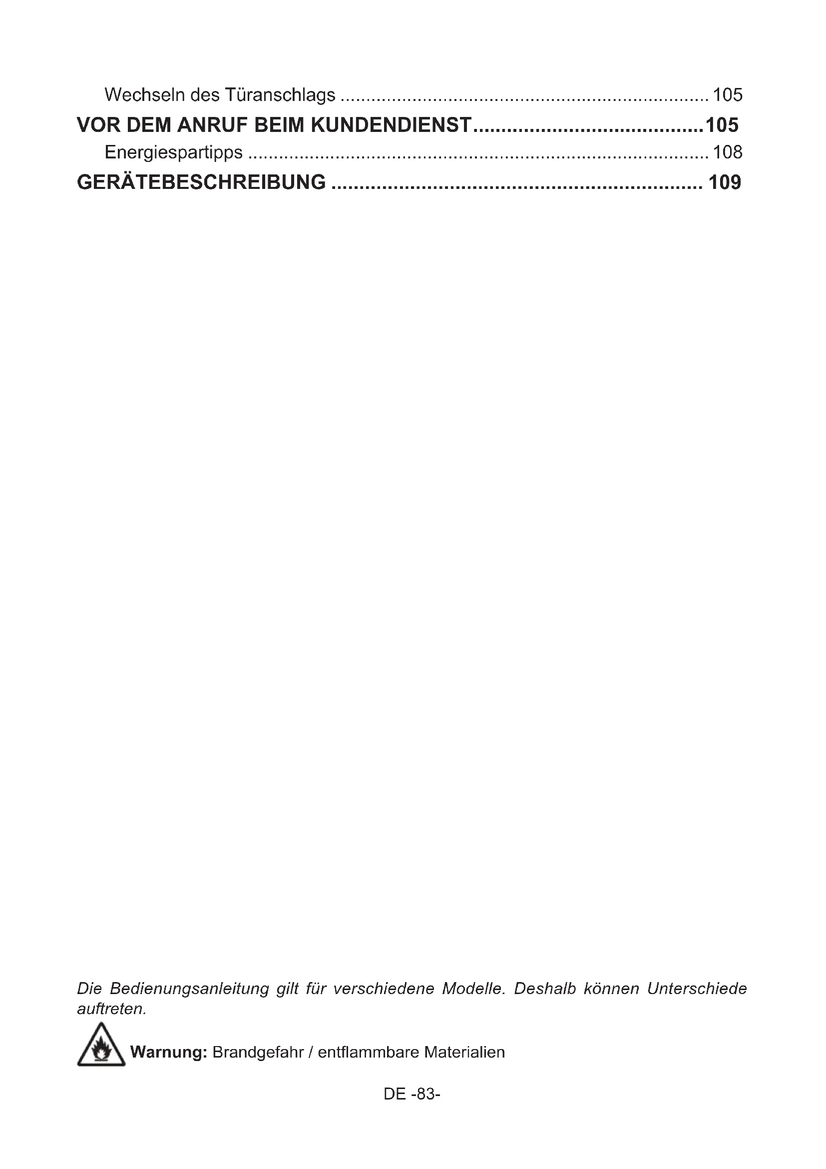 Die Bedienungsanleitung gilt für verschiedene Modelle. Deshalb können Unterschiede auftreten. Warnung: Brandgefahr / entflammbare Materialien Wechseln des Türanschlags ........................................................................ 105