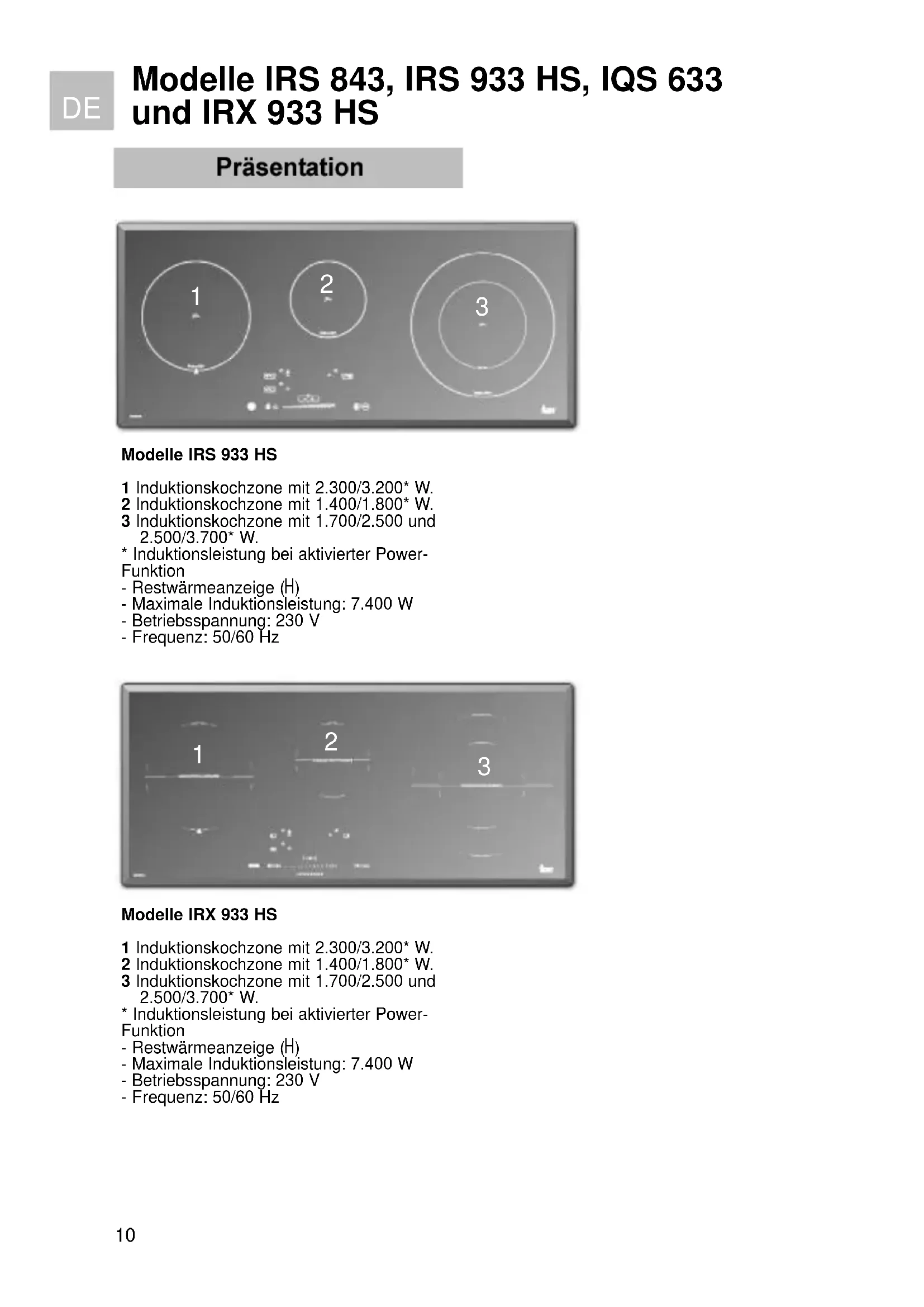 Modelle IRS 933 HS 1 Induktionskochzone mit 2.300/3.200* W. 2 Induktionskochzone mit 1.400/1.800* W. 3 Induktionskochzone mit 1.700/2.500 und 2.500/3.700* W.