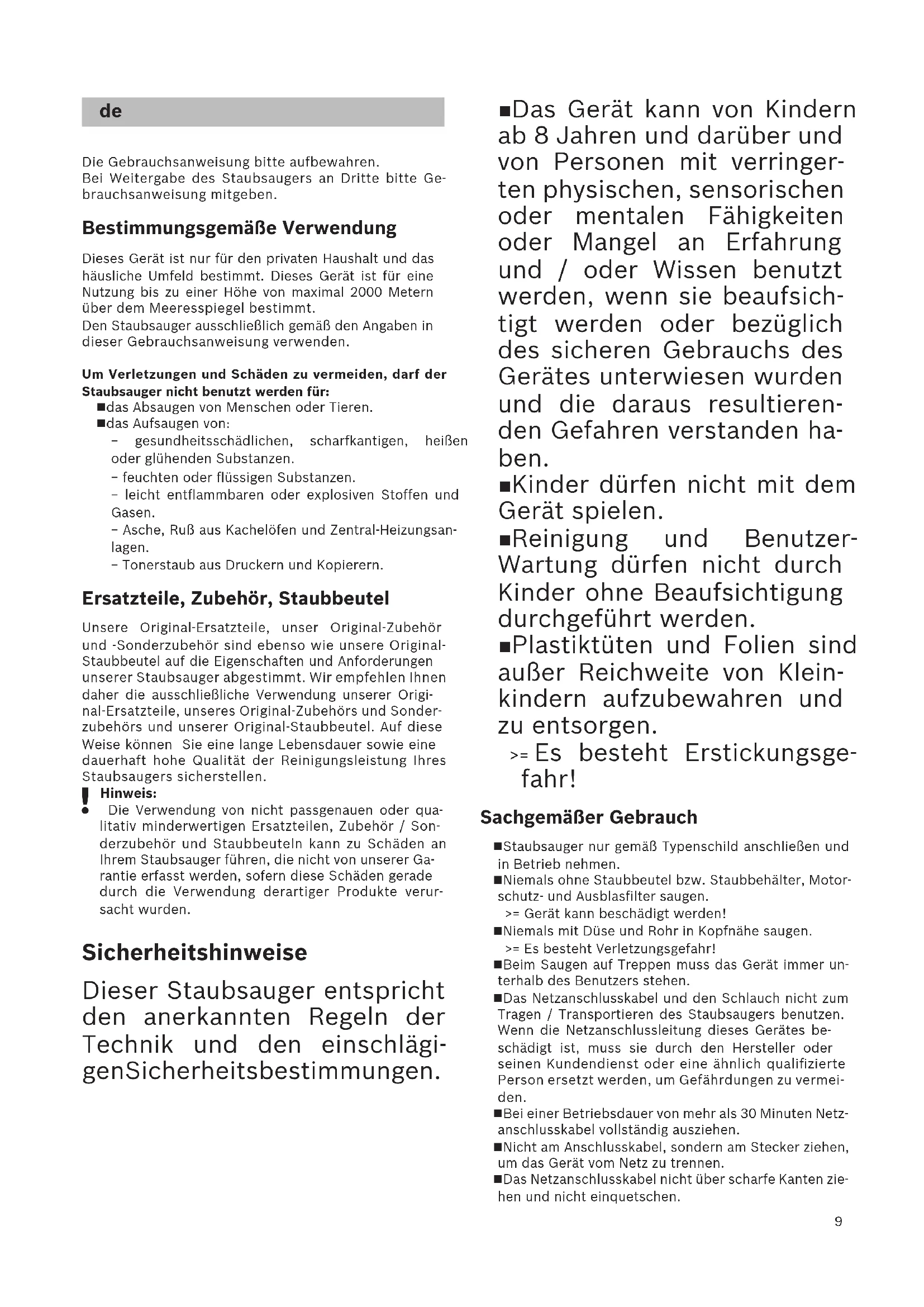 Die Gebrauchsanweisung bitte aufbewahren. Bei Weitergabe des Staubsaugers an Dritte bitte Ge-brauchsanweisung mitgeben. Bestimmungsgemäße Verwendung Dieses Gerät ist nur für den privaten Haushalt und das häusliche Umfeld bestimmt. Dieses Gerät ist für eine Nutzung bis zu einer Höhe von maximal 2000 Metern über dem Meeresspiegel bestimmt. Den Staubsauger ausschließlich gemäß den Angaben in dieser Gebrauchsanweisung verwenden.Um Verletzungen und Schäden zu vermeiden, darf der Staubsauger nicht benutzt werden für: das Absaugen von Menschen oder Tieren. das Aufsaugen von: − gesundheitsschädlichen, scharfkantigen, heißen oder glühenden Substanzen. − feuchten oder flüssigen Substanzen. − leicht entflammbaren oder explosiven Stoffen und Gasen. − Asche, Ruß aus Kachelöfen und Zentral-Heizungsan-lagen. − Tonerstaub aus Druckern und Kopierern. Ersatzteile, Zubehör, Staubbeutel Unsere Original-Ersatzteile, unser Original-Zubehör und -Sonderzubehör sind ebenso wie unsere Original-Staubbeutel auf die Eigenschaften und Anforderungen unserer Staubsauger abgestimmt. Wir empfehlen Ihnen daher die ausschließliche Verwendung unserer Origi-nal-Ersatzteile, unseres Original-Zubehörs und Sonder-zubehörs und unserer Original-Staubbeutel. Auf diese Weise können Sie eine lange Lebensdauer sowie eine dauerhaft hohe Qualität der Reinigungsleistung Ihres Staubsaugers sicherstellen. Hinweis: Die Verwendung von nicht passgenauen oder qua-litativ minderwertigen Ersatzteilen, Zubehör / Son-derzubehör und Staubbeuteln kann zu Schäden an Ihrem Staubsauger führen, die nicht von unserer Ga-rantie erfasst werden, sofern diese Schäden gerade durch die Verwendung derartiger Produkte verur-sacht wurden. Sicherheitshinweise Dieser Staubsauger entspricht den anerkannten Regeln der Technik und den einschlägi- genSicherheitsbestimmungen. Das Gerät kann von Kindern ab 8 Jahren und darüber und von Personen mit verringer- ten physischen, sensorischen oder mentalen Fähigkeiten oder Mangel an Erfahrung und / oder Wissen benutzt werden, wenn sie beaufsich- tigt werden oder bezüglich des sicheren Gebrauchs des Gerätes unterwiesen wurden und die daraus resultieren- den Gefahren verstanden ha- ben. Kinder dürfen nicht mit dem Gerät spielen. Reinigung und Benutzer- Wartung dürfen nicht durch Kinder ohne Beaufsichtigung durchgeführt werden. Plastiktüten und Folien sind außer Reichweite von Klein- kindern aufzubewahren und zu entsorgen. >= Es besteht Erstickungsge- fahr! Sachgemäßer Gebrauch Staubsauger nur gemäß Typenschild anschließen und in Betrieb nehmen. Niemals ohne Staubbeutel bzw. Staubbehälter, Motor-schutz- und Ausblasfilter saugen. >= Gerät kann beschädigt werden! Niemals mit Düse und Rohr in Kopfnähe saugen. >= Es besteht Verletzungsgefahr! Beim Saugen auf Treppen muss das Gerät immer un-terhalb des Benutzers stehen. Das Netzanschlusskabel und den Schlauch nicht zum Tragen / Transportieren des Staubsaugers benutzen. Wenn die Netzanschlussleitung dieses Gerätes be-schädigt ist, muss sie durch den Hersteller oder seinen Kundendienst oder eine ähnlich qualifizierte Person ersetzt werden, um Gefährdungen zu vermei- den. Bei einer Betriebsdauer von mehr als 30 Minuten Netz-anschlusskabel vollständig ausziehen. Nicht am Anschlusskabel, sondern am Stecker ziehen, um das Gerät vom Netz zu trennen. Das Netzanschlusskabel nicht über scharfe Kanten zie-hen und nicht einquetschen. de10 Achten Sie darauf, dass der Netzstecker beim automa- tischen Kabeleinzug nicht gegen Personen, Körpertei- le, Tiere oder Gegenstände geschleudert wird. Netzanschlusskabel mit Hilfe des Netzsteckers führen. Vor allen Arbeiten am Staubsauger Netzstecker zie- hen. Beschädigten Staubsauger nicht in Betrieb nehmen. Beim Vorliegen einer Störung Netzstecker ziehen. Um Gefährdungen zu vermeiden, dürfen Reparaturen und Ersatzteileaustausch am Staubsauger nur vom au- torisierten Kundendienst durchgeführt werden. Staubsauger vor Witterungseinflüssen, Feuchtigkeit und Hitzequellen schützen. Keine brennbaren oder alkoholhaltigen Stoffe auf die Filter (Staubbeutel, Motorschutzfilter, Ausblasfilter etc.) geben. Staubsauger ist für den Baustellenbetrieb nicht geeig- net. >= Einsaugen von Bauschutt kann zur Beschädigung des Gerätes führen. Gerät ausschalten und Netzstecker ziehen, wenn nicht gesaugt wird. Ausgediente Geräte sofort unbrauchbar machen, da- nach das Gerät einer ordnungsgemäßen Entsorgung zuführen.