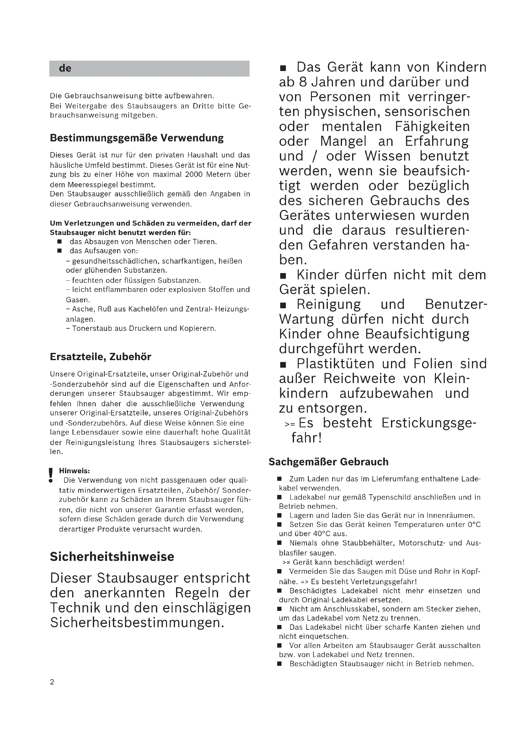 Die Gebrauchsanweisung bitte aufbewahren.Bei Weitergabe des Staubsaugers an Dritte bitte Ge-brauchsanweisung mitgeben. Bestimmungsgemäße Verwendung Dieses Gerät ist nur für den privaten Haushalt und das häusliche Umfeld bestimmt. Dieses Gerät ist für eine Nut-zung bis zu einer Höhe von maximal 2000 Metern über dem Meeresspiegel bestimmt.Den Staubsauger ausschließlich gemäß den Angaben in dieser Gebrauchsanweisung verwenden.Um Verletzungen und Schäden zu vermeiden, darf der Staubsauger nicht benutzt werden für: das Absaugen von Menschen oder Tieren. das Aufsaugen von: − gesundheitsschädlichen, scharfkantigen, heißen oder glühenden Substanzen. − feuchten oder flüssigen Substanzen. − leicht entflammbaren oder explosiven Stoffen und Gasen. − Asche, Ruß aus Kachelöfen und Zentral- Heizungs-anlagen. − Tonerstaub aus Druckern und Kopierern. Ersatzteile, Zubehör Unsere Original-Ersatzteile, unser Original-Zubehör und -Sonderzubehör sind auf die Eigenschaften und Anfor-derungen unserer Staubsauger abgestimmt. Wir emp-fehlen Ihnen daher die ausschließliche Verwendung unserer Original-Ersatzteile, unseres Original-Zubehörs und -Sonderzubehörs. Auf diese Weise können Sie eine lange Lebensdauer sowie eine dauerhaft hohe Qualität der Reinigungsleistung Ihres Staubsaugers sicherstel- len.