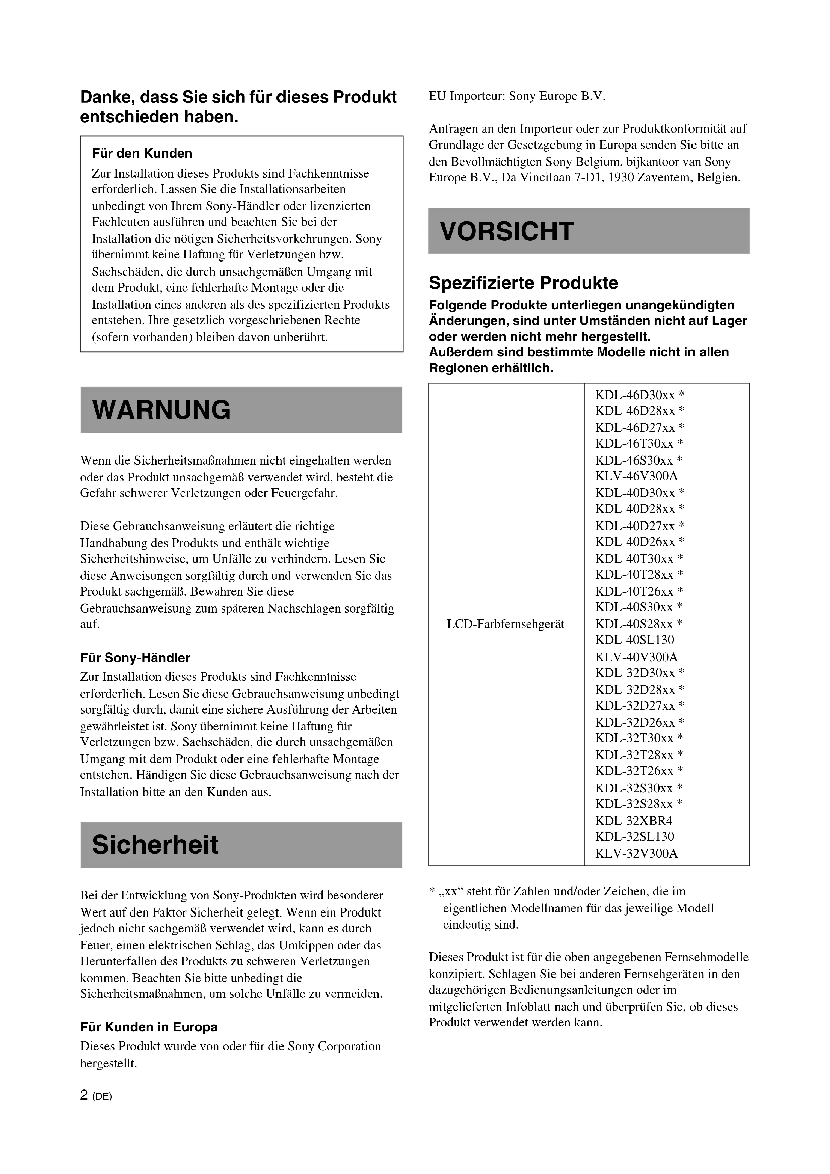 - „xx“ steht für Zahlen und/oder Zeichen, die im eigentlichen Modellnamen für das jeweilige Modell eindeutig sind. Dieses Produkt ist für die oben angegebenen Fernsehmodelle konzipiert. Schlagen Sie bei anderen Fernsehgeräten in den dazugehörigen Bedienungsanleitungen oder im mitgelieferten Infoblatt nach und überprüfen Sie, ob dieses Produkt verwendet werden kann. Für den Kunden Zur Installation dieses Produkts sind Fachkenntnisse erforderlich. Lassen Sie die Installationsarbeiten unbedingt von Ihrem Sony-Händler oder lizenzierten Fachleuten ausführen und beachten Sie bei der Installation die nötigen Sicherheitsvorkehrungen. Sony übernimmt keine Haftung für Verletzungen bzw. Sachschäden, die durch unsachgemäßen Umgang mit dem Produkt, eine fehlerhafte Montage oder die Installation eines anderen als des spezifizierten Produkts entstehen. Ihre gesetzlich vorgeschriebenen Rechte (sofern vorhanden) bleiben davon unberührt. WARNUNG Sicherheit VORSICHT LCD-Farbfernsehgerät KDL-46D30xx * KDL-46D28xx * KDL-46D27xx * KDL-46T30xx * KDL-46S30xx *