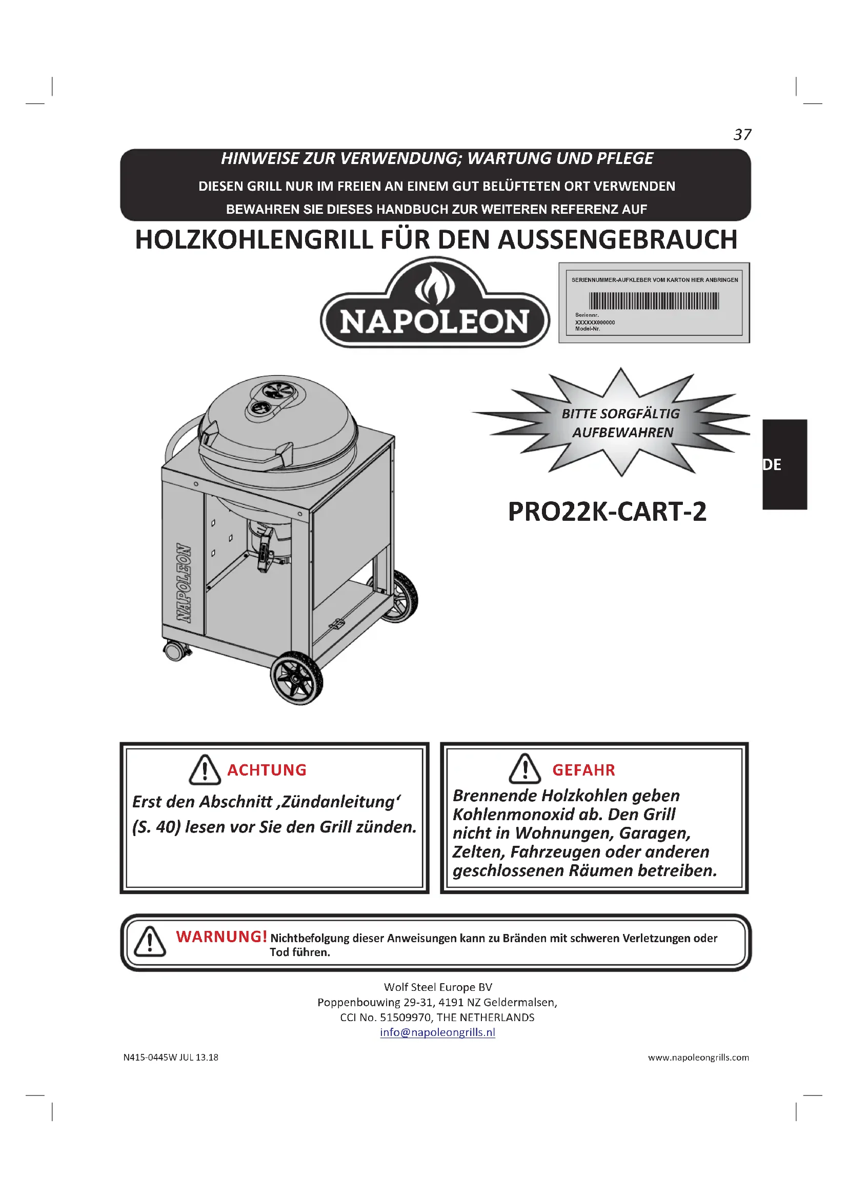 ACHTUNG Erst den Abschni ‚Zündanleitung‘ (S. 40) lesen vor Sie den Grill zünden. SERIENNUMMER-AUFKLEBER VOM KARTON HIER ANBRINGENSeriennr. XXXXXX000000Model-Nr. GEFAHR Brennende Holzkohlen geben Kohlenmonoxid ab. Den Grill nicht in Wohnungen, Garagen, Zelten, Fahrzeugen oder anderen geschlossenen Räumen betreiben.