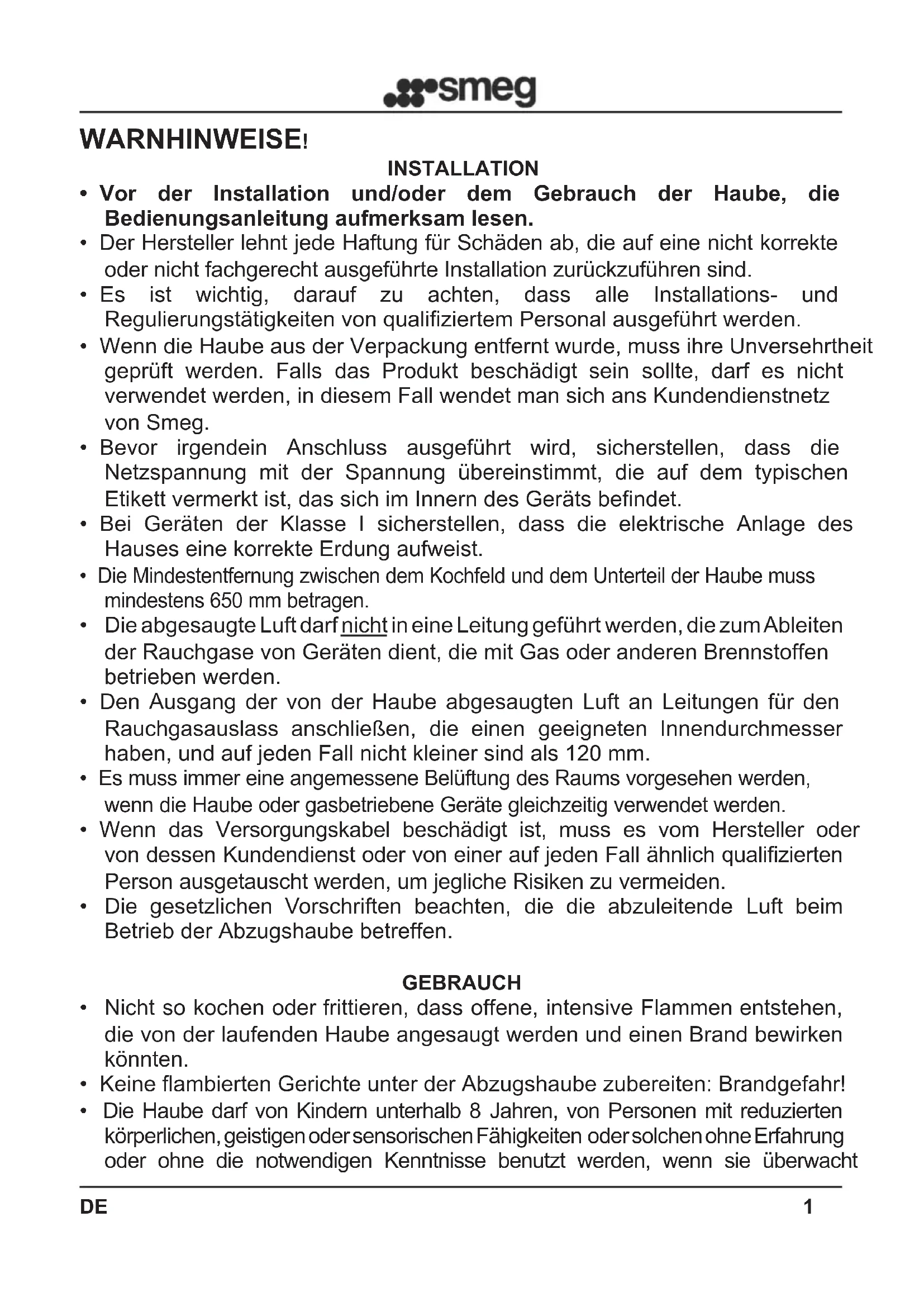 - Vor der Installation und/oder dem Gebrauch der Haube, die Bedienungsanleitung aufmerksam lesen.