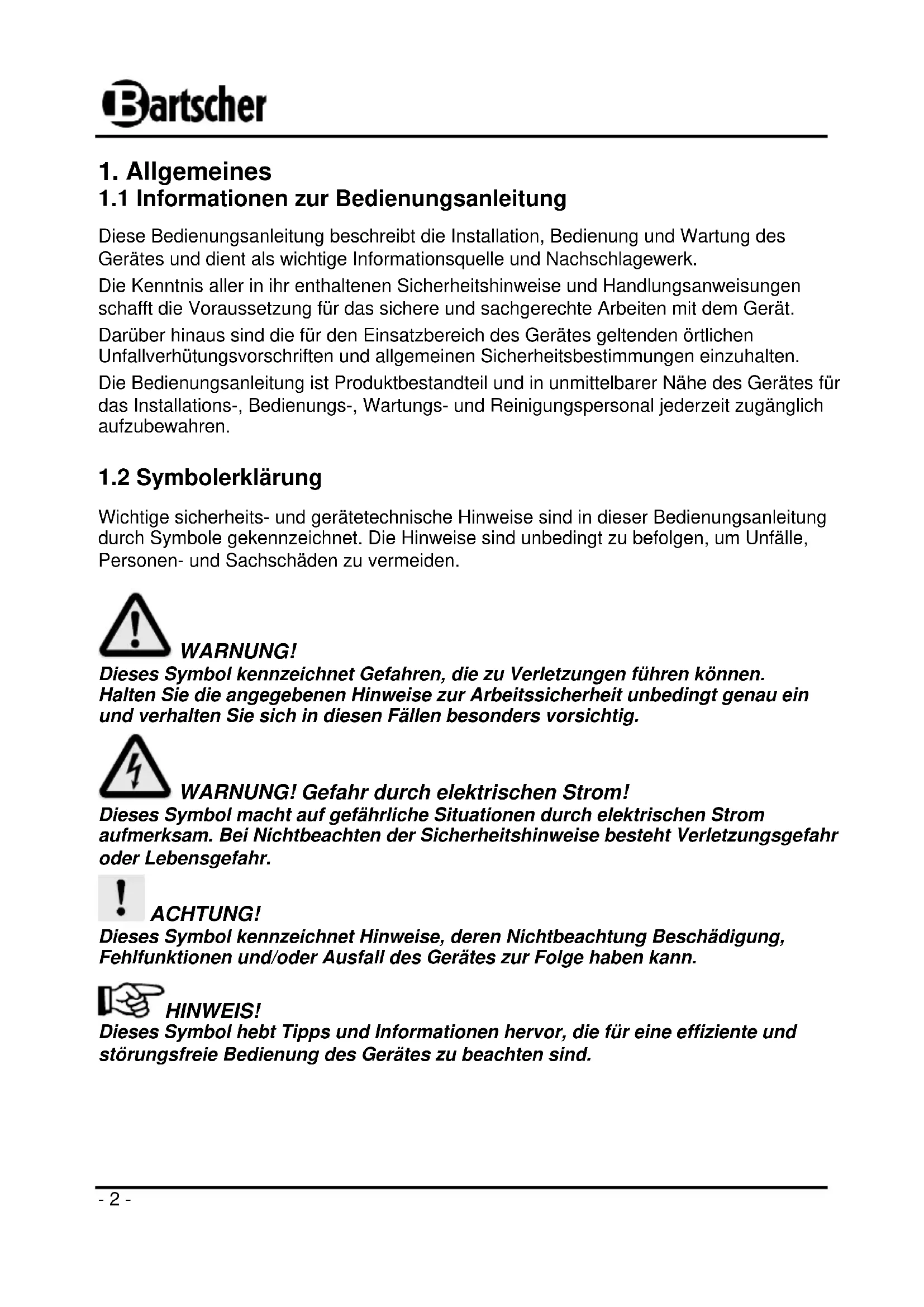 Diese Bedienungsanleitung beschreibt die Installation, Bedienung und Wartung des Gerätes und dient als wichtige Informationsquelle und Nachschlagewerk. Die Kenntnis aller in ihr enthaltenen Sicherheitshinweise und Handlungsanweisungen schafft die Voraussetzung für das sichere und sachgerechte Arbeiten mit dem Gerät. Darüber hinaus sind die für den Einsatzbereich des Gerätes geltenden örtlichen Unfallverhütungsvorschriften und allgemeinen Sicherheitsbestimmungen einzuhalten. Die Bedienungsanleitung ist Produktbestandteil und in unmittelbarer Nähe des Gerätes für das Installations-, Bedienungs-, Wartungs- und Reinigungspersonal jederzeit zugänglich aufzubewahren.