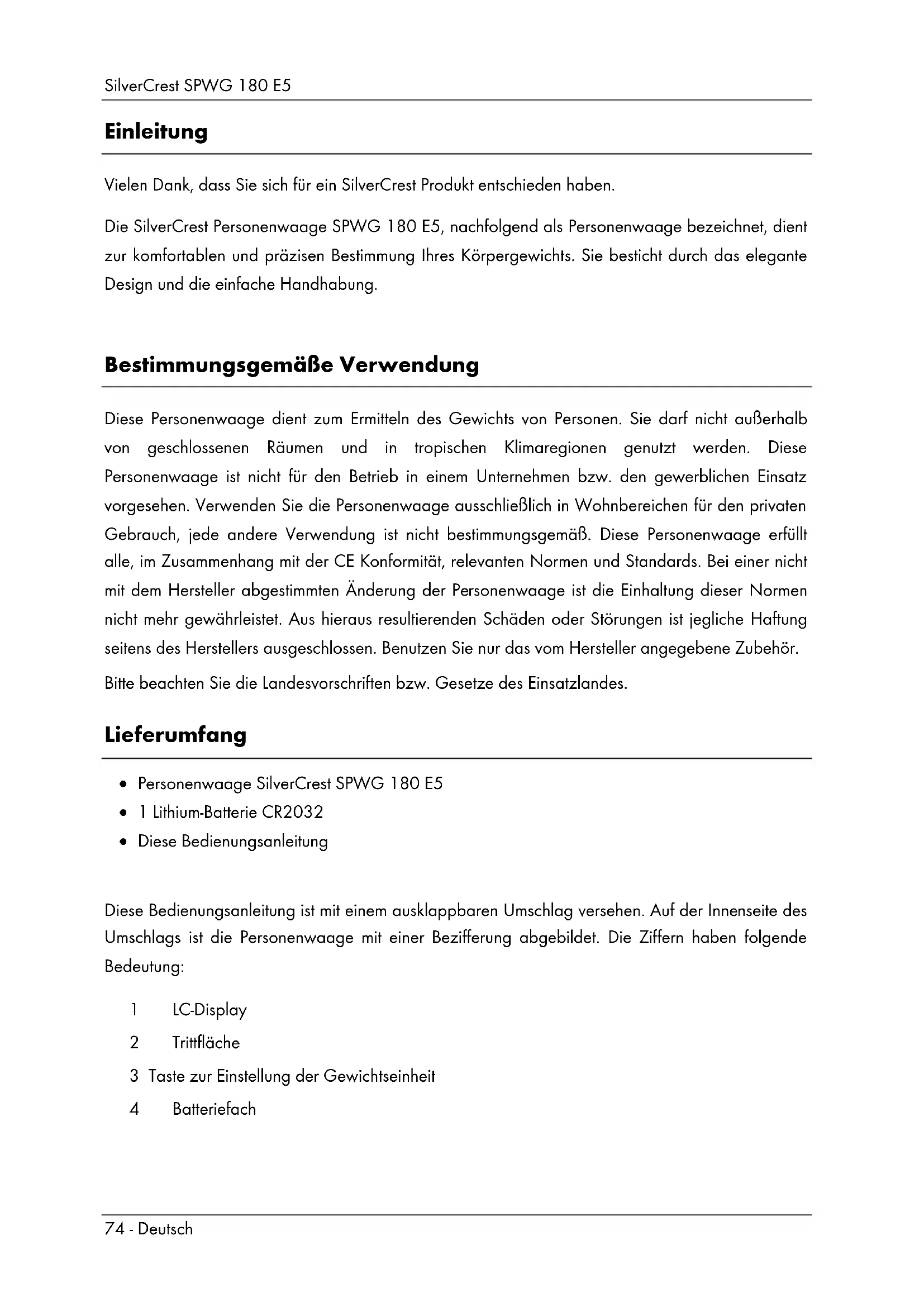 Einleitung Vielen Dank, dass Sie sich für ein SilverCrest Produkt entschieden haben. Die SilverCrest Personenwaage SPWG 180 E5, nachfolgend als Personenwaage bezeichnet, dient zur komfortablen und präzisen Bestimmung Ihres Körpergewichts. Sie besticht durch das elegante Design und die einfache Handhabung. Bestimmungsgemäße Verwendung Diese Personenwaage dient zum Ermitteln des Gewichts von Personen. Sie darf nicht außerhalb von geschlossenen Räumen und in tropischen Klimaregionen genutzt werden. Diese Personenwaage ist nicht für den Betrieb in einem Unternehmen bzw. den gewerblichen Einsatz vorgesehen. Verwenden Sie die Personenwaage ausschließlich in Wohnbereichen für den privaten Gebrauch, jede andere Verwendung ist nicht bestimmungsgemäß. Diese Personenwaage erfüllt alle, im Zusammenhang mit der CE Konformität, relevanten Normen und Standards. Bei einer nicht mit dem Hersteller abgestimmten Änderung der Personenwaage ist die Einhaltung dieser Normen nicht mehr gewährleistet. Aus hieraus resultierenden Schäden oder Störungen ist jegliche Haftung seitens des Herstellers ausgeschlossen. Benutzen Sie nur das vom Hersteller angegebene Zubehör. Bitte beachten Sie die Landesvorschriften bzw. Gesetze des Einsatzlandes. Lieferumfang Personenwaage SilverCrest SPWG 180 E5 1 Lithium-Batterie CR2032 Diese Bedienungsanleitung Diese Bedienungsanleitung ist mit einem ausklappbaren Umschlag versehen. Auf der Innenseite des Umschlags ist die Personenwaage mit einer Bezifferung abgebildet. Die Ziffern haben folgende Bedeutung: 1 LC-Display 2 Trittfläche 3 Taste zur Einstellung der Gewichtseinheit 4 BatteriefachSilverCrest SPWG 180 E5 Deutsch - 75 Technische Daten Betriebsspannung: 3 V Batterie: 1 x 3 V-Lithium-Batterie CR2032 Batterielaufzeit: ca. 5 Jahre (bei täglicher Nutzungsdauer von 60 Sek.) Gewichtseinheiten: kg / lb / st (umschaltbar) Maximalgewicht: max. 180 kg / 396 lb Einteilung: 0,1 kg / 0,2 lb Messtoleranz: +/- (1 % +0,1 kg/ 0,2 lb) bei 30 kg bis 180 kg Auto-Power-off: ca. 10 Sekunden Abmessungen (B x T x H): 300 x 315 x 23 mm Gewicht: ca. 2 kg Betriebstemperatur: +10°C bis +40°C Änderungen der technischen Daten sowie des Designs können ohne Ankündigung erfolgen. Sicherheitshinweise Vor der ersten Verwendung der Personenwaage lesen Sie die folgenden Anweisungen genau durch und beachten Sie alle Warnhinweise, selbst wenn Ihnen der Umgang mit elektronischen Geräten vertraut ist. Bewahren Sie diese Bedienungsanleitung sorgfältig als zukünftige Referenz auf. Wenn Sie die Personenwaage verkaufen oder weitergeben, händigen Sie unbedingt auch diese Bedienungsanleitung aus. WARNUNG! Dieses Symbol kennzeichnet wichtige Hinweise für den sicheren Betrieb der Personenwaage und zum Schutz des Anwenders. Dieses Symbol kennzeichnet, dass die Personenwaage nicht mit feuchten, bzw. nassen Füßen betreten werden darf. Ebenfalls nicht, wenn die Trittfläche feucht oder nass ist. Sie könnten ausrutschen und es besteht Verletzungsgefahr.SilverCrest SPWG 180 E5