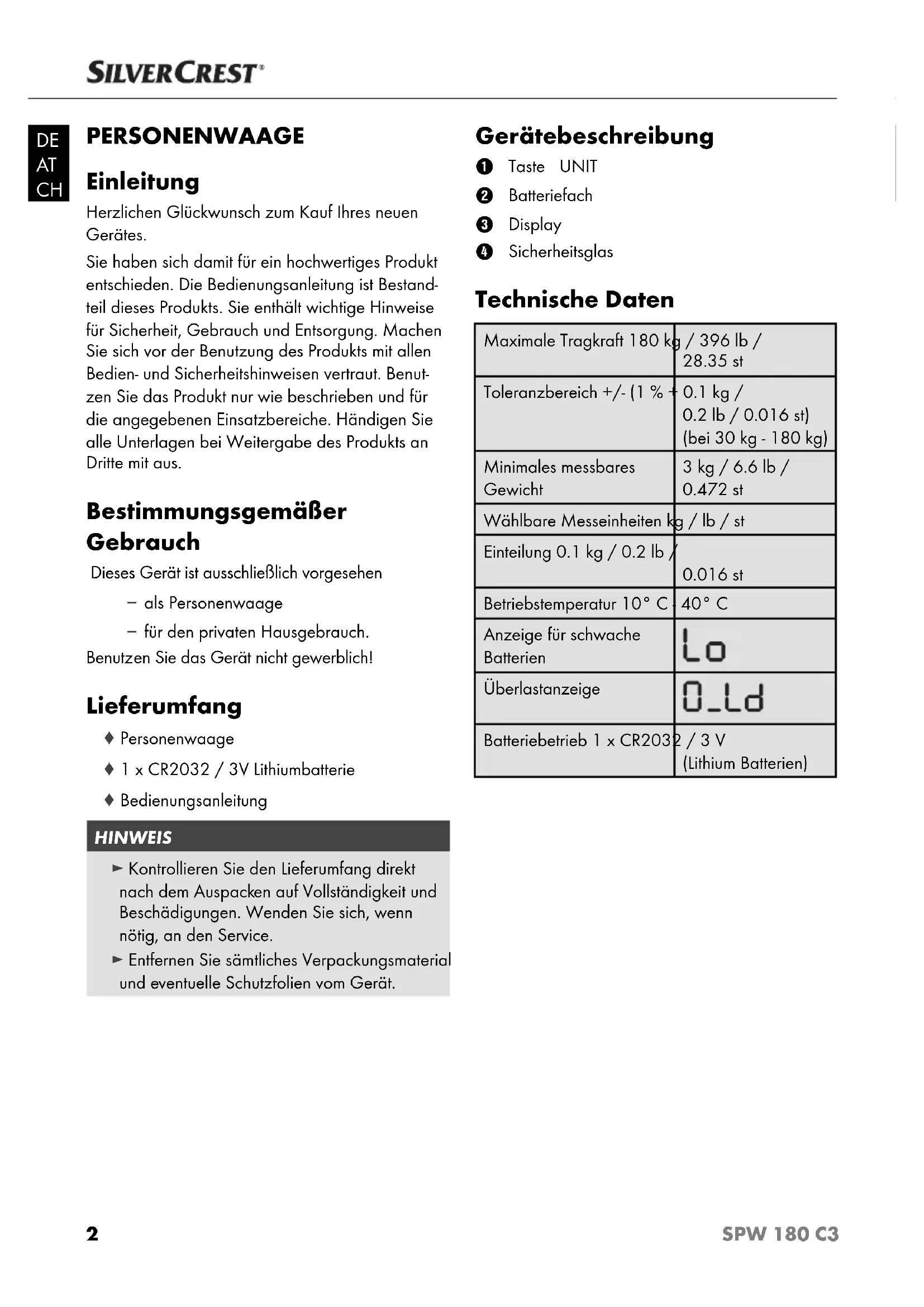 SPW 180 C3 - Waagen SILVERCREST - Kostenlose Bedienungsanleitung