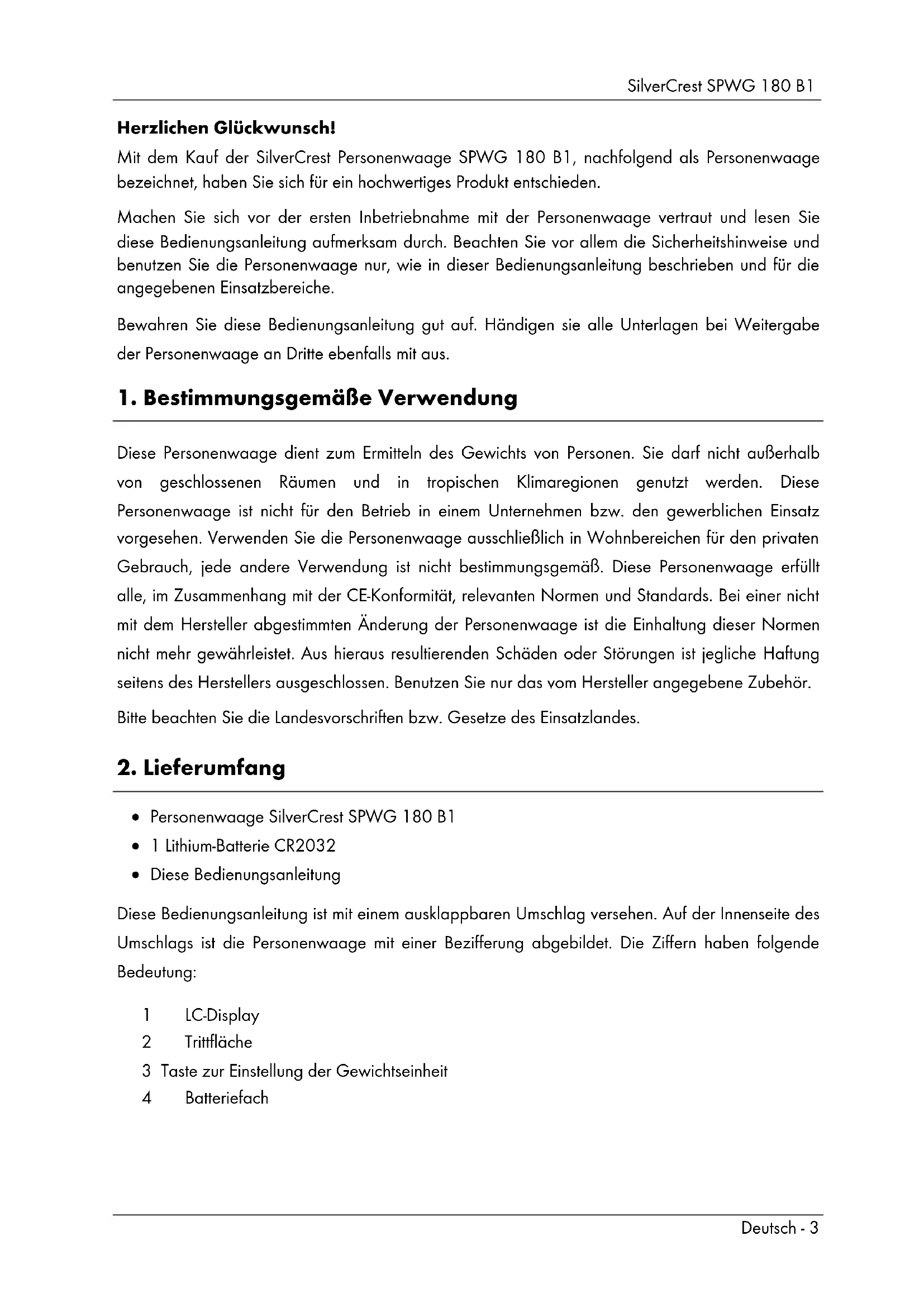 Personenwaage SilverCrest SPWG 180 B1 1 Lithium-Batterie CR2032 Diese Bedienungsanleitung Diese Bedienungsanleitung ist mit einem ausklappbaren Umschlag versehen. Auf der Innenseite des Umschlags ist die Personenwaage mit einer Bezifferung abgebildet. Die Ziffern haben folgende Bedeutung: 1 LC-Display 2 Trittfläche 3 Taste zur Einstellung der Gewichtseinheit 4 BatteriefachSilverCrest SPWG 180 B1