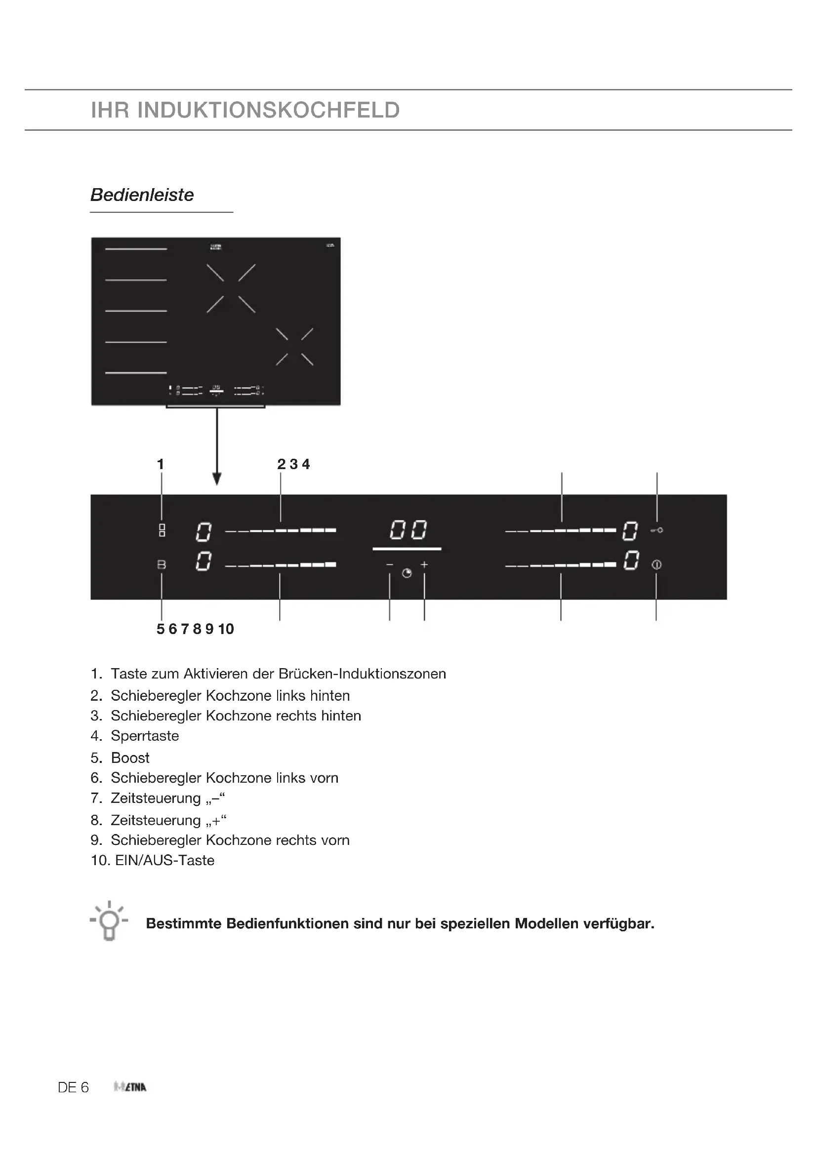 - polystyrène exempt de CFC (mousse rigide PS). Éliminez ces matériaux de manière responsable et conformément aux dispositions administratives. À titre de rappel de la nécessité d'éliminer les appareils ménagers séparément, le produit est marqué du symbole représentant une poubelle roulante barrée. Ce symbole indique qu'au terme de son utilisation, le produit ne doit pas être éliminé en tant que déchet urbain. Il doit être remis à l’un des centres de collecte sélective prévus par l’administration locale ou à un revendeur assurant ce service. L'élimination séparée des appareils ménagers évite les éventuelles conséquences environnementales et sanitaires négatives pouvant résulter d'une mise au rebut inappropriée, et permet de récupérer et de recycler les matériaux constitutifs afin de réaliser des économies substantielles d’énergie et de matières brutes. Déclaration de conformité Nous déclarons que nos produits sont conformes aux directives, décisions et régulations européennes applicables et aux exigences énumérées dans les normes référencées.FR 24DE 3 INHALT Ihr Induktionskochfeld Einführung 4 Beschreibung 5 Bedienleiste 6 Sicherheit Überhitzungsschutz 7 Kochzeitbegrenzung 7 Gesund kochen 7 Verwendung Induktionsgeräusche 8 Kochgeschirr 8 Leistungsstufen einstellen 9 Kochgeschirrerkennung 10 Garzeit/Kurzzeituhr 10 „Boost“ 10 Anzeigen auf dem Display 11 Tabelle der Kochfeldfunktionen 11 Zeit steuerung 11 „Boost“ 11 Leistungsstufen 12 Kochtipps 13 Bedienung Kochvorgang starten 14 Kochen beenden 15 Timer-Steuerung 15 Brücken-Induktionszonen verbinden 17 Verwendung der Tastensperre/Kindersicherung 18 Pflege Reinigung 19 Fehlerbehebung Allgemeines 20 Störungstabelle 20 Technische Daten Informationen zur Verordnung (EU) 66/2014 22 Umweltschutz Entsorgung von Gerät und Verpackung 23DE 4 Einführung Dieses Kochfeld wurde für echte Koch-Fans entwickelt! Kochen mit Induktionskochfeldern bietet eine Reihe von Vorteilen. Das Kochfeld reagiert schnell und kann auch auf äußerst niedrige Leistung eingestellt werden. Dank der hohen Leistung wird schnell der Siedepunkt von Speisen erreicht. Der großzügige Abstand zwischen den Kochzonen macht das Kochen sehr bequem. Beim Kochen mit Induktionskochfeldern sind im Vergleich zu herkömmlichen Geräten einige Besonderheiten zu beachten. Die Wärmeerzeugung erfolgt bei Induktionskochfeldern mit Magnetfeldern. Deshalb ist nicht jeder Topf ohne Weiteres verwendbar. Weitere Informationen hierzu finden Sie im Kapitel „Kochgeschirr“. Für optimale Sicherheit verfügt das Gerät über Funktionen zum Überhitzungsschutz sowie eine Restwärmeanzeige. In dieser Bedienungsanleitung wird beschrieben, wie Sie Ihr Induktionskochfeld optimal verwenden können. Neben Informationen zur Bedienung erhalten Sie auch Hintergrundinformationen, die bei der Verwendung dieses Produkts hilfreich sein können. Außerdem finden Sie Kochtabellen und Pflegetipps. Lesen Sie diese Bedienungsanleitung vor der ersten Inbetriebnahme sorgfältig durch, und heben Sie diese zum späteren Nachlesen gut auf. Die Bedienungsanleitung ist auch ein wichtiges Referenzmaterial für Kundendiensttechniker. Kleben Sie deshalb bitte das Typenschild des Geräts in das vorgesehene Kästchen hinten in der Bedienungsanleitung. Das Typenschild des Geräts enthält alle Informationen, die der Kundendienst benötigt, um angemessen auf Ihre Fragen reagieren zu können. Die Installationsanweisungen sind separat mitgeliefert. Wir wünschen viel Freude beim Kochen! IHR INDUKTIONSKOCHFELDDE 5 Beschreibung