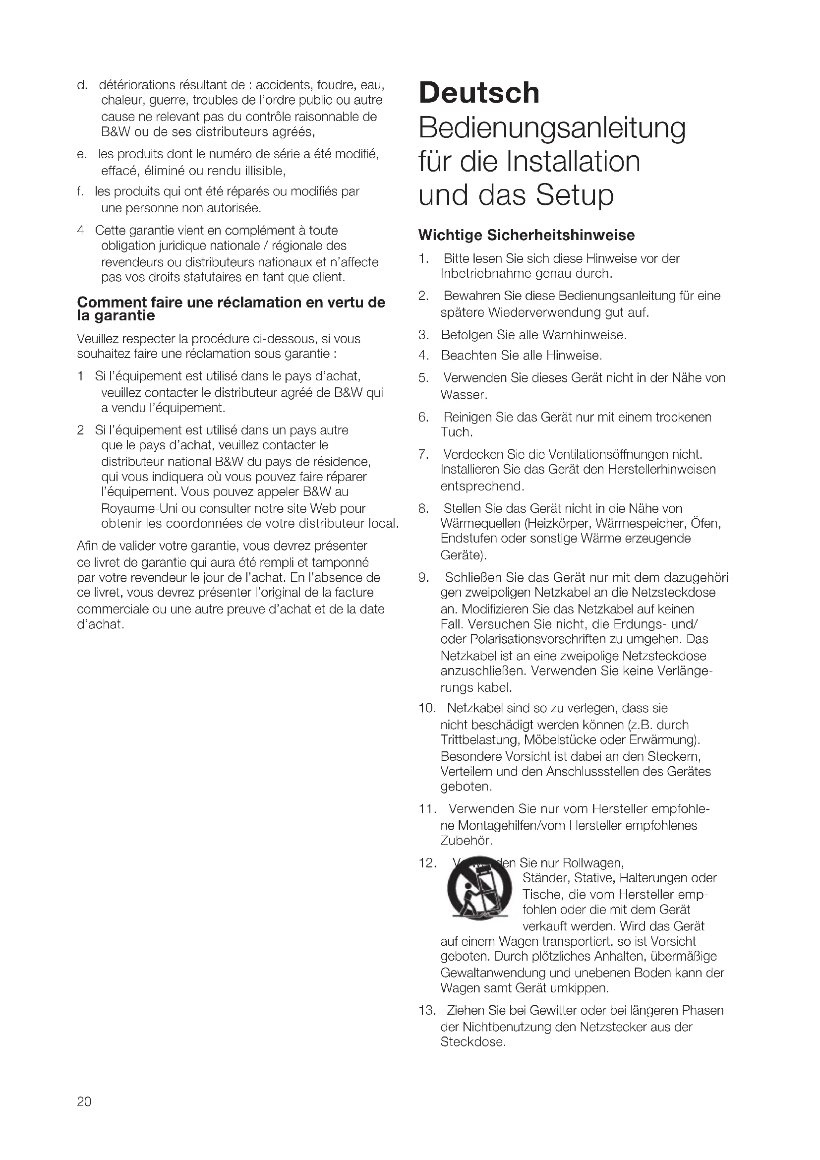 Garantie Dieses Produkt wurde nach den höchsten Qualitäts- standards entwickelt und hergestellt. Sollte dennoch der unwahrscheinliche Fall eintreten, dass Sie als Kunde Grund zur Reklamation haben, werden die B&W Group Ltd. und ihre nationalen Vertriebsorganisa- tionen das fehlerhafte Produkt ohne Berechnung der Arbeits- und Materialkosten (abgesehen von einigen Ausnahmen) in jedem Land, in dem eine offizielle B&W- Vertriebsorganisation vertreten ist, reparieren. Die Garantiezeit beträgt fünf Jahre ab Kaufdatum bzw. zwei Jahre auf Aktivlautsprecher und Elektronik. Beachten Sie auch die Garantiebedin gungen der B&W-Group Germany GmbH. Garantiebedingungen